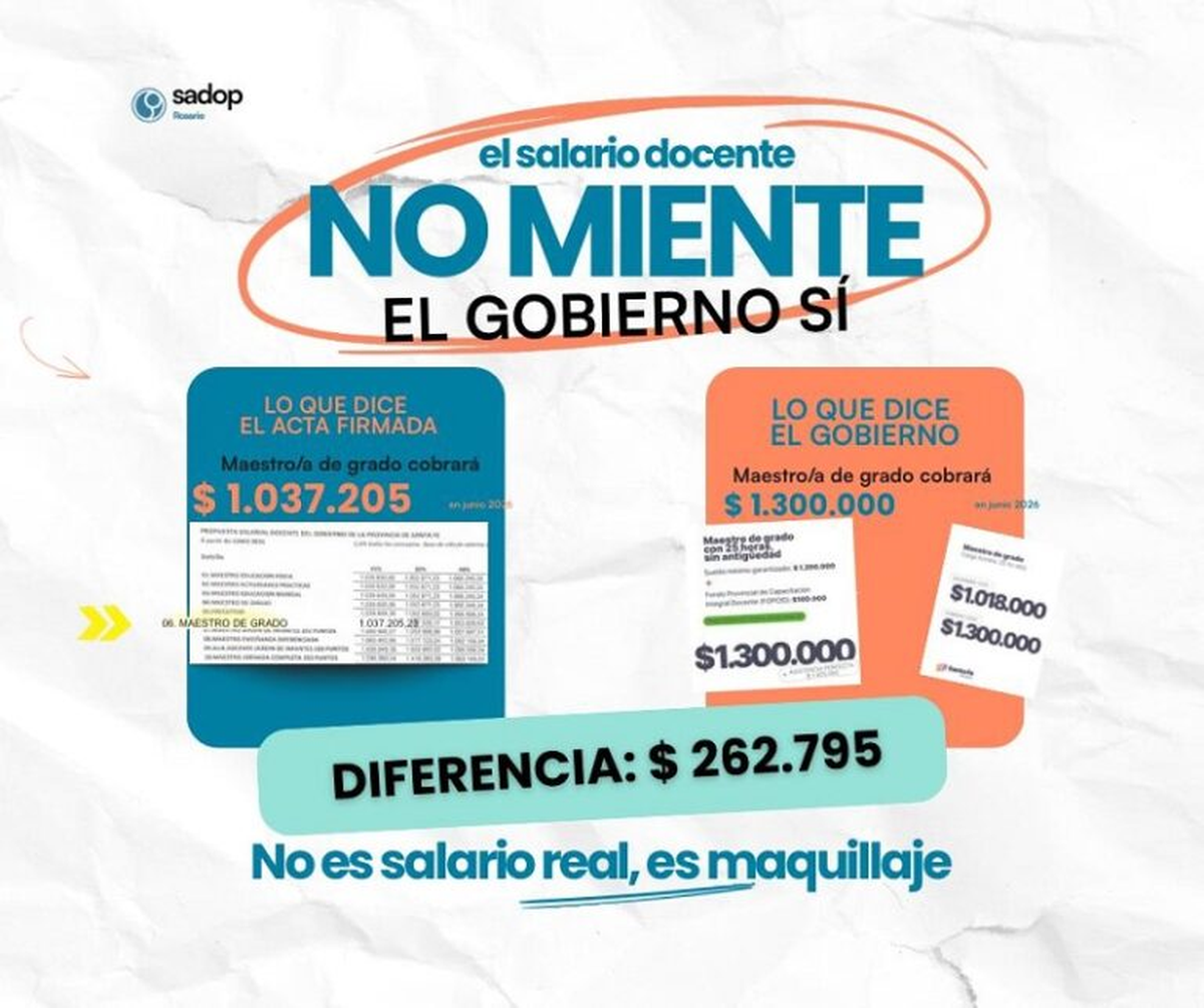 Bajo su argumento, Sadop volvió a poner sobre la mesa la comparación con otros sectores del Estado. Mientras el Gobierno de Santa Fe sostiene que la Provincia tiene uno de los mejores docentes del país, Lucero indicó que "el salario de un cargo testigo docente asciende a $1.040.000, cifra que está muy por debajo de otras áreas de la administración pública".