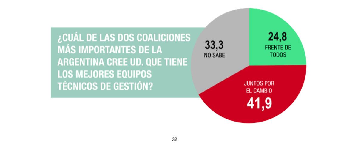Otro dato que tal vez incomode al think tank que se referencia en Cristina Kirchner es que quienes creen que el principal espacio opositor tiene "los mejores equipos técnicos de gestión" superan holgadamente a los que piensan que esos recursos están en el oficialismo (41,9% y 24,8%, respectivamente). Esto sugiere una mayor confianza en JxC en términos de gestión. Un 33%, en tanto, permanece indeciso.