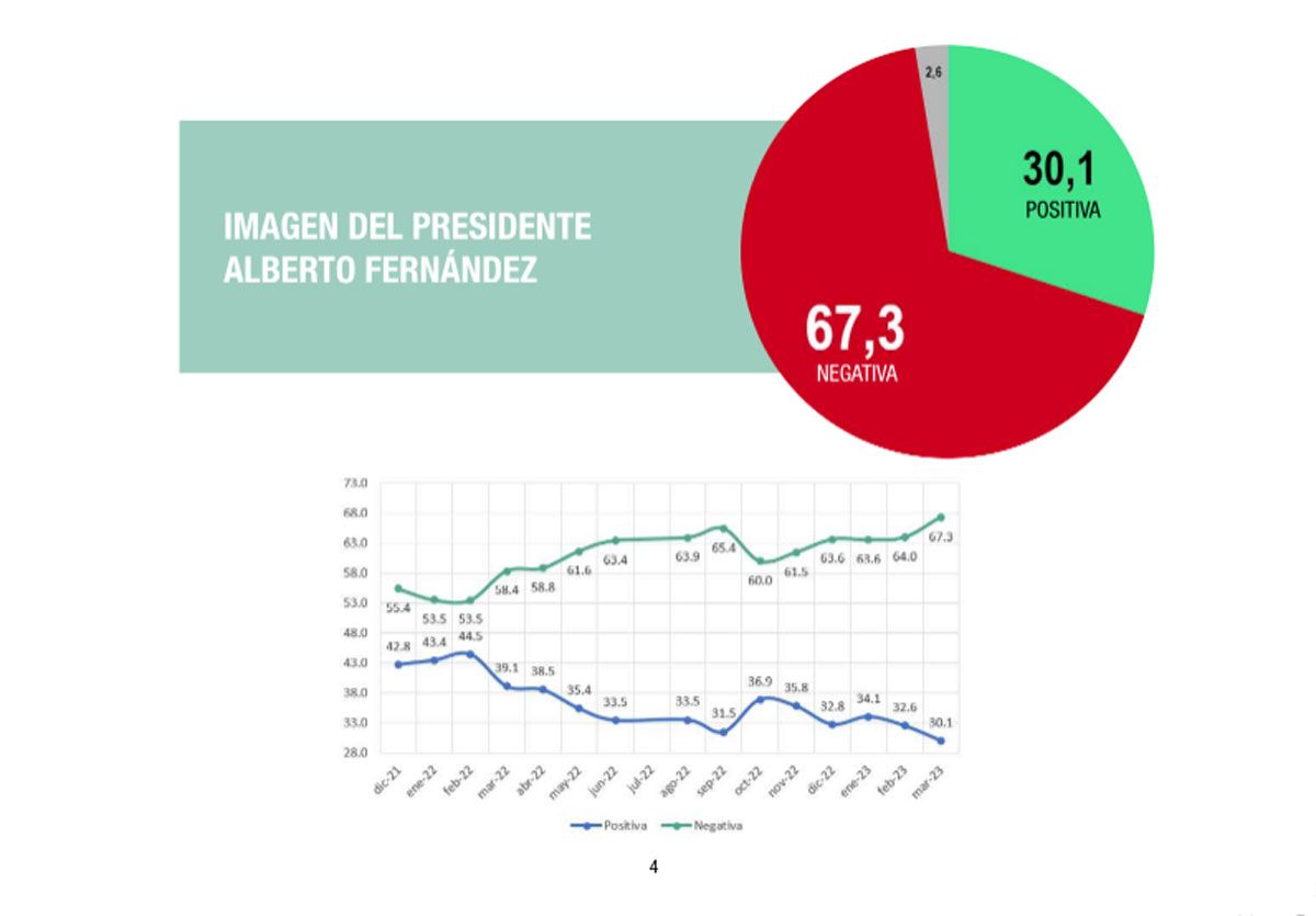 En ese contexto, la imagen negativa de Alberto Fernández rompió la estabilidad de los últimos meses y exhibió una suba de más de 3 puntos en marzo, hasta el 67,3%, mientras que la aprobación "se ubicó en el entorno de los 30 puntos, el peor valor de toda la serie que se inicia en diciembre de 2019".