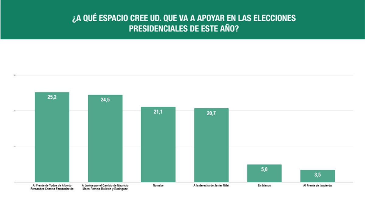 A diferencia de otros trabajos, el de Analogías pone al oficialismo encabezando las preferencias con el 25,2%, pero menos de un punto más abajo (24,5%) aparece JxC, lo que arroja un escenario de enorme paridad. "La derecha de Milei" cosecha 20 puntos, que por el margen de error de la encuesta (+/-2%) logra meterse en un virtual triple empate. Aunque más que la opción libertaría reúnen los indecisos (21,1%).
