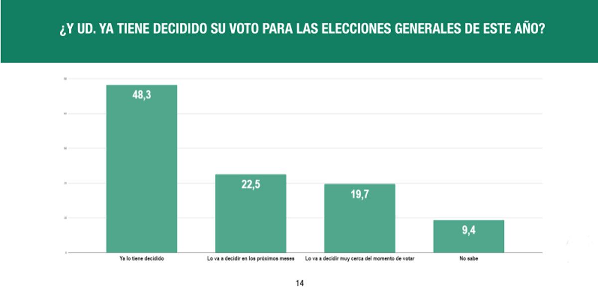 En cuanto a la intención de voto, lejos están los resultados de ser definitivos ya que, como muestra la encuesta, sólo el 48,3% respondió que tiene su voto decidido, mientras que un 22,5% afirma que lo decidirá "en los próximos meses" y un 19,7%, que lo hará "muy cerca del momento de votar".