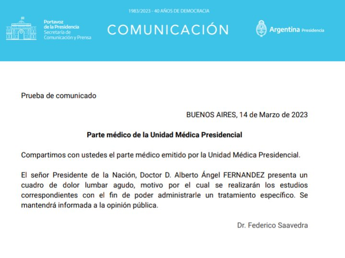 “El señor Presidente de la Nación presenta un cuadro de dolor lumbar agudo, motivo por el cual se realizarán los estudios correspondientes con el fin de poder administrarle un tratamiento específico. Se mantendrá informada a la opinión pública”, dice el breve parte firmado por Federico Saavedra, médico de cabecera del mandatario desde hace más de 10 años que hoy dirige la Unidad Médica Presidencial.