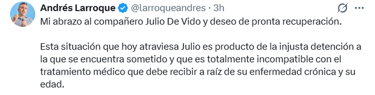 "Esta situación que hoy atraviesa Julio es producto de la injusta detención a la que se encuentra sometido y que es totalmente incompatible con el tratamiento médico que debe recibir a raíz de su enfermedad crónica y su edad", agregó.