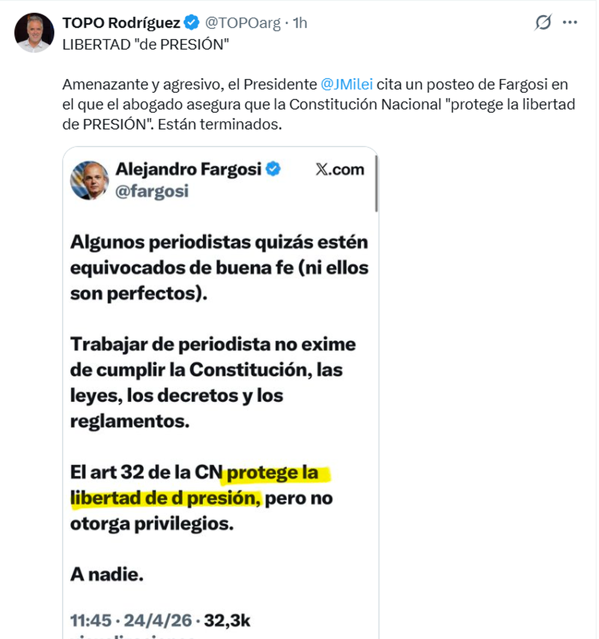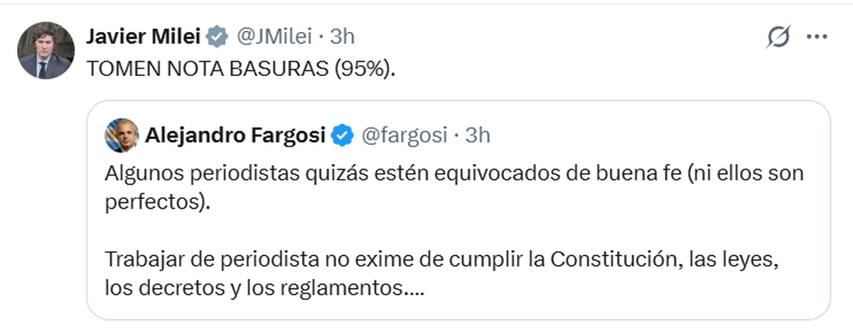 El diputado nacional de La Libertad Avanza, Alejandro Fargosi, publicó un mensaje en X, y el Presidente lo compartió en su cuenta de dicha red social, asegurando que "trabajar de periodista no exime de cumplir la Constitución, las leyes, los decretos y los reglamentos". Hasta ahí, todo ok.