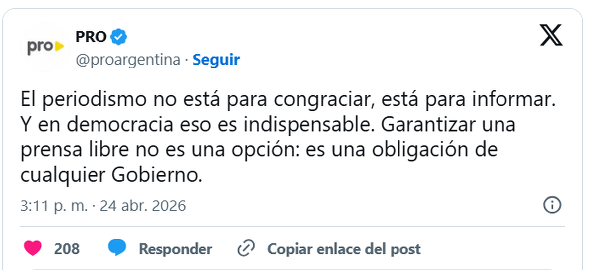 "El periodismo no está para congraciar, está para informar. Y en democracia eso es indispensable", publicó el espacio que lidera Mauricio Macri, principal aliado político del oficialismo, en un breve mensaje.