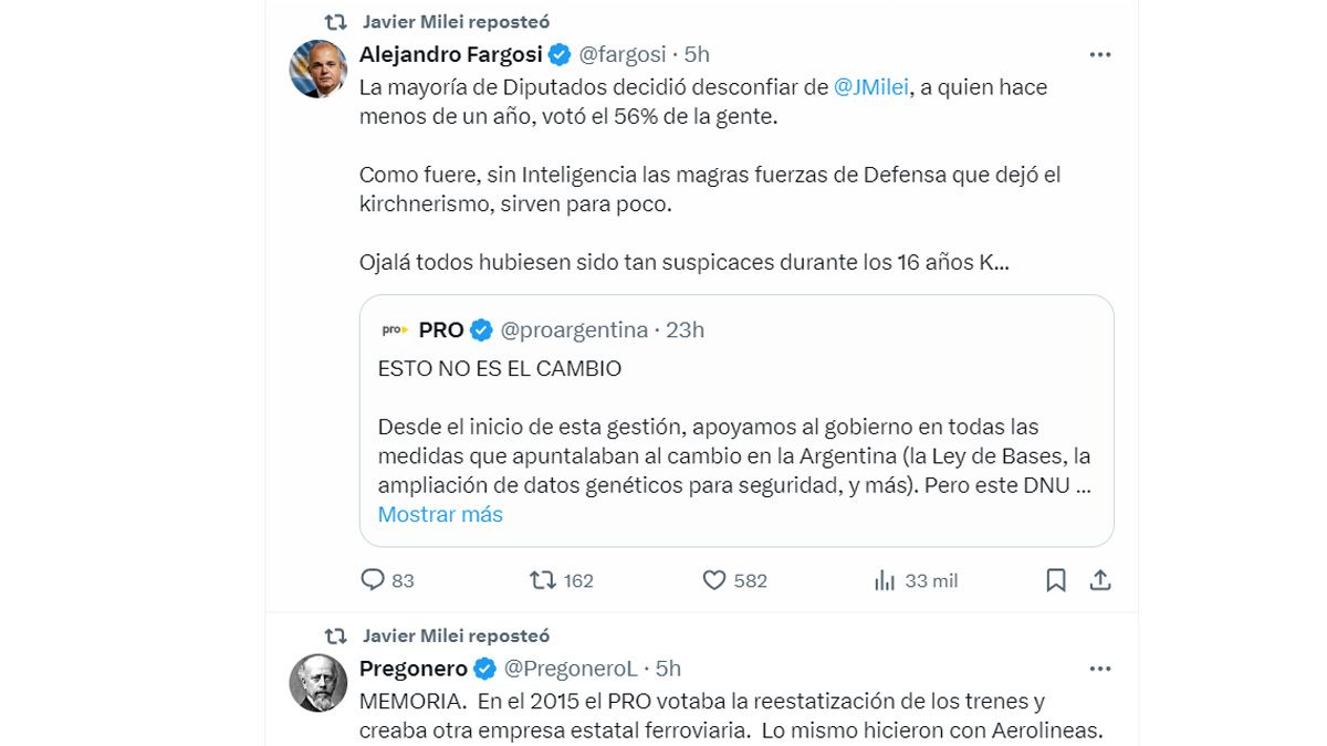 En las últimas horas, Javier Milei se expresó sobre la votación del macrismo en Diputados, pero a través de comentarios de otros usuarios que compartió en su cuenta de X.
