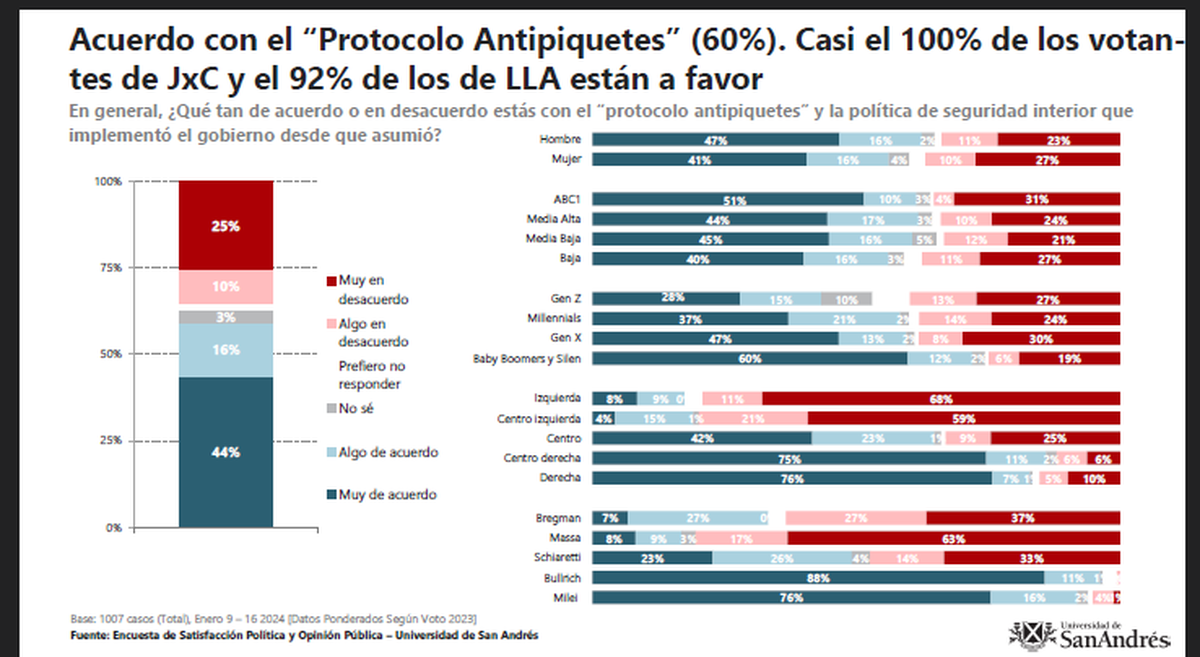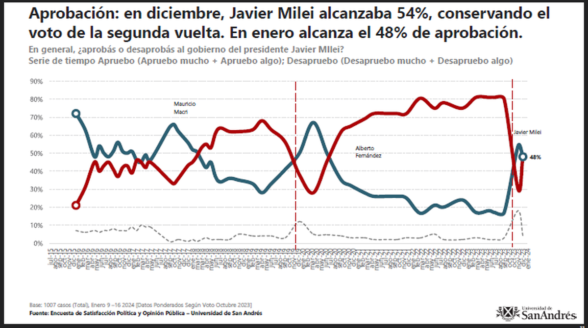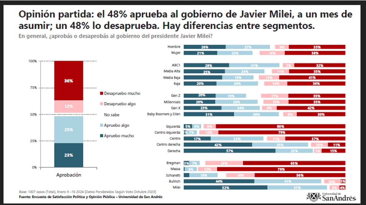 En total, quienes realizan la encuesta sobre la gestión de Javier Milei para la Universidad de San Andrés llevaron a cabo 1.000 consultas entre el 9 y el 16 de Enero de 2024 participando adultos con edades superiores a los 18 años que estuvieran conectados a internet.