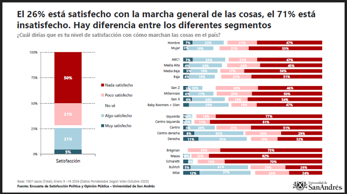 3-El nivel de satisfacción con la marcha general del país en enero alcanza apenas al 26%, mientras que la insatisfacción es del 71%. Casi tres a uno en contra.