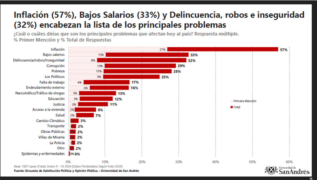2-Se registra una caída de 6 puntos porcentuales en la imagen de la administración nacional. De 54 a 48 %. Los encargados de los muestreos consideraron que el principal problema que afecta al país actualmente es la inflación (57%), seguido de los bajos salarios (33%) y la delincuencia (32%)