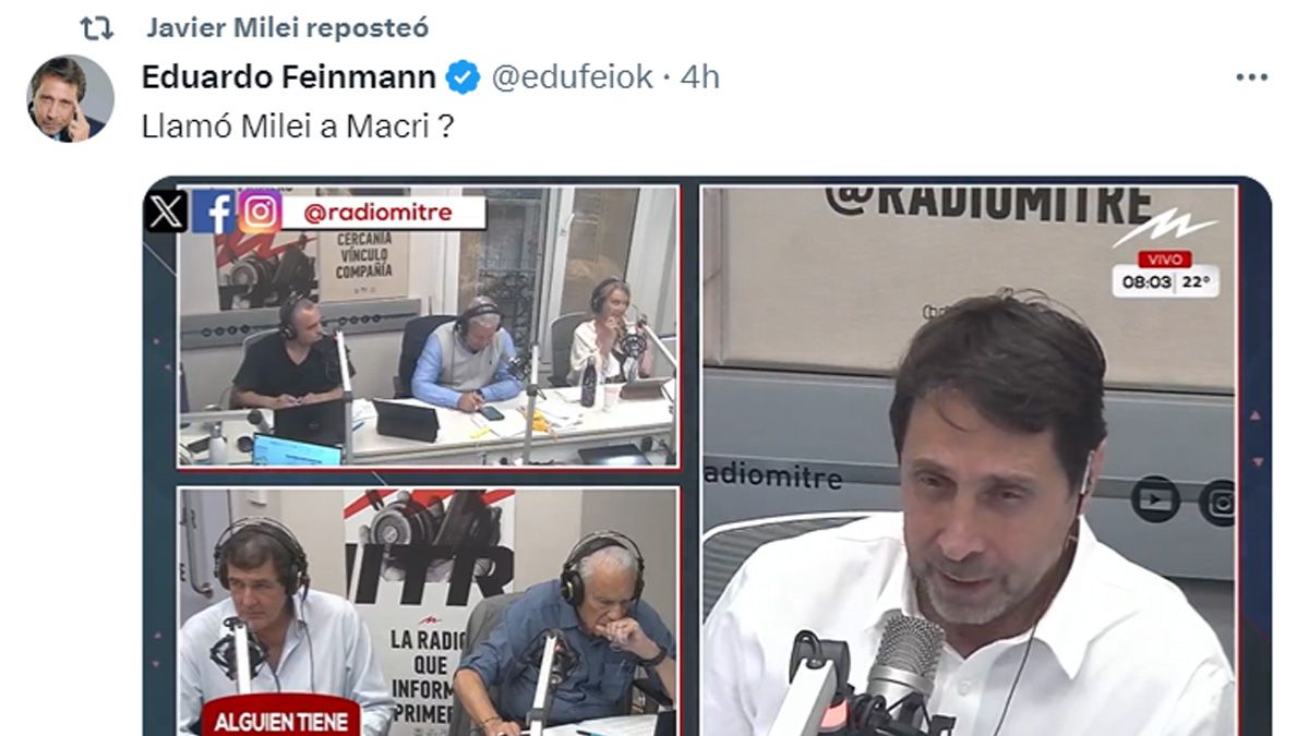 Javier Milei compartió un mensaje de Eduardo Feinmann acerca de las versiones de que habría llamado a Macri para "putearlo" por no ir a votar en Boca.