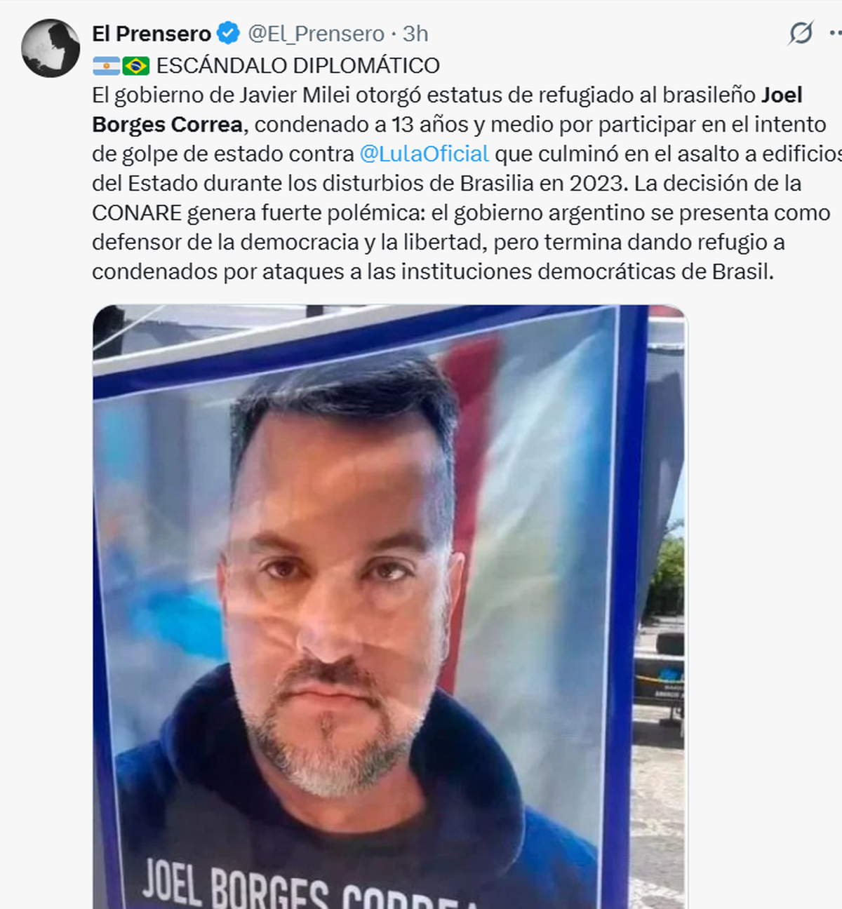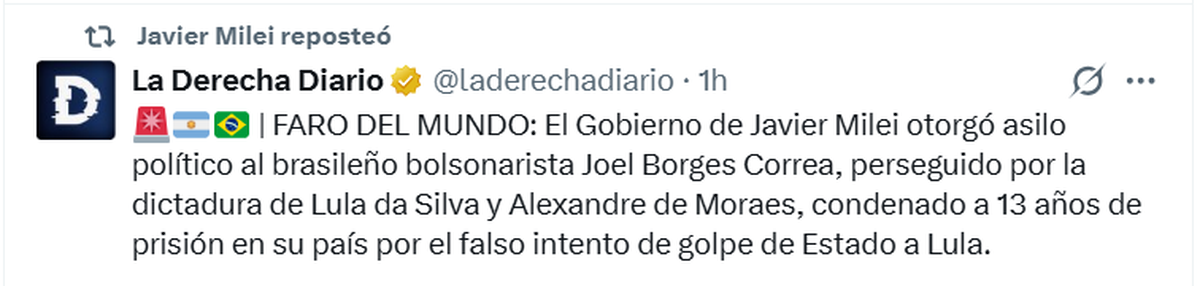 ¿"Faro del mundo" o asilo de golpistas? Javier Milei celebró en redes sociales haberle concedido estatus de "refugiado" a Joel Borges Correa, condenado por la Justicia de Brasil a 13 años y 6 meses de prisión por el intento de golpe a Lula Da Silva en enero de 2023. En diciembre pasado, el juez Daniel Rafecas había ordenado su extradición.