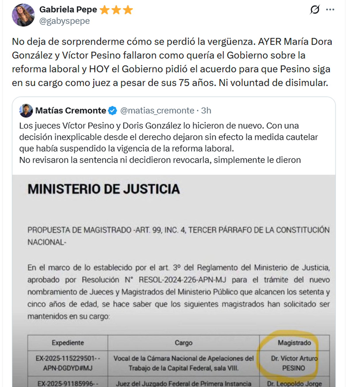 Hoy, el ministerio de Justicia recomendó al Senado la continuidad en su cargo de Pesino, vocal de la Sala VIII de la Cámara Nacional de Apelaciones del Trabajo de la Capital Federal. La cartera que lidera Juan Bautista Mahiques informó oficialmente que Pesino solicitó ser mantenido en sus cargo y activó la etapa protocolar de publicidad y participación ciudadana previa a una eventual decisión del Poder Ejecutivo. La convocatoria también alcanza a Leopoldo Jorge Rago Gallo, juez del Juzgado Federal de Primera Instancia N° 2 de San Juan.
