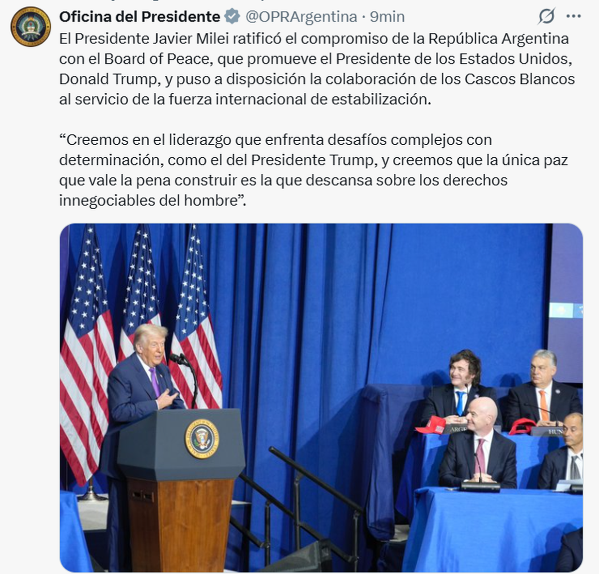 Javier Milei anunció que pone a disposición de Donald Trump la colaboración de los Cascos Blancos al servicio de la fuerza internacional de estabilización.