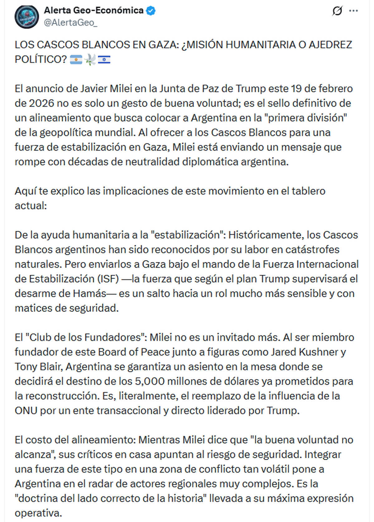 Históricamente, los Cascos Blancos argentinos han sido reconocidos por su labor en catástrofes naturales, pero enviarlos a Gaza bajo el mando de la Fuerza Internacional de Estabilización (ISF) —la fuerza que según el plan Donald Trump supervisará el desarme de Hamás— es un salto hacia un rol mucho más sensible y con matices de seguridad, explica la cuenta Alerta Geo-Económica, dando otra visión de la cuestión.