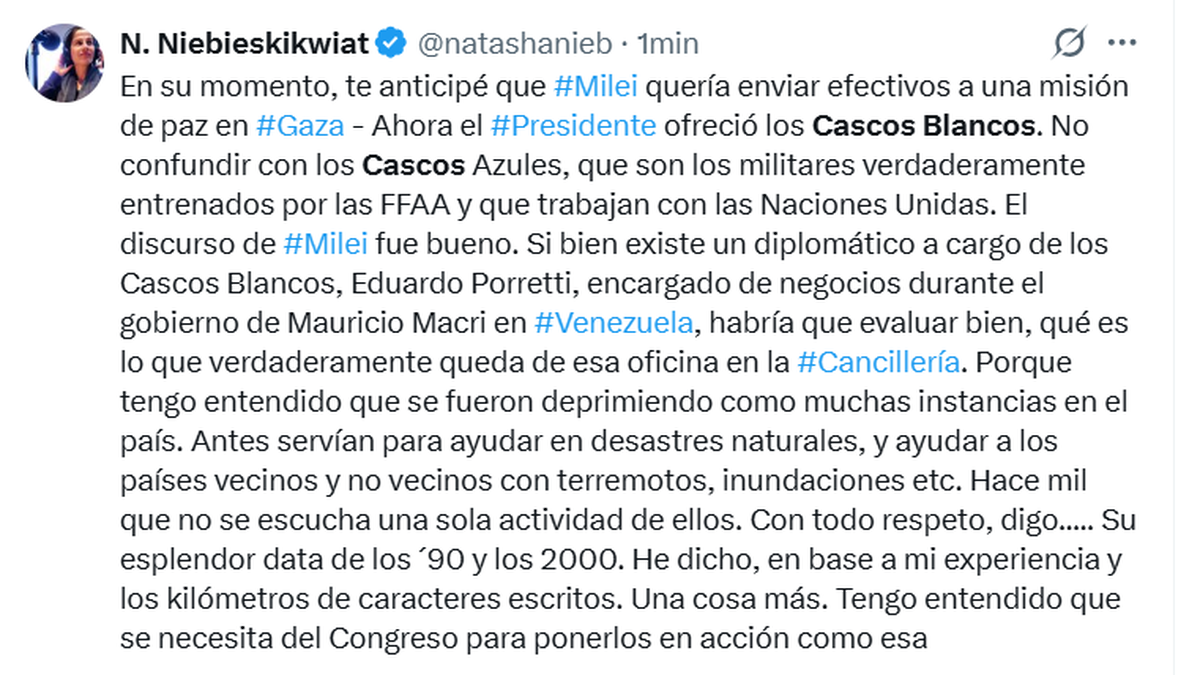 "Antes servían para ayudar en desastres naturales, y ayudar a los países vecinos y no vecinos con terremotos, inundaciones etc. Hace mil que no se escucha una sola actividad de ellos. Con todo respeto, digo..... Su esplendor data de los ´90 y los 2000", escribió la periodista especializada en internacionales, Natasha Niebieskikwiat.