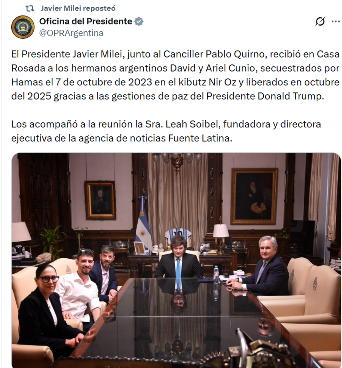Javier Milei recibió en la Casa Rosada a Ariel y David Cunio, dos hermanos argentinos -que viven en Israel- que habían sido secuestrados por Hamas el 7 de octubre de 2023, y liberados en octubre del 2025. También participaron del encuentro el canciller Pablo Quirno y la fundadora y directora ejecutiva de la agencia de noticias Fuente Latina, Leah Soibel.