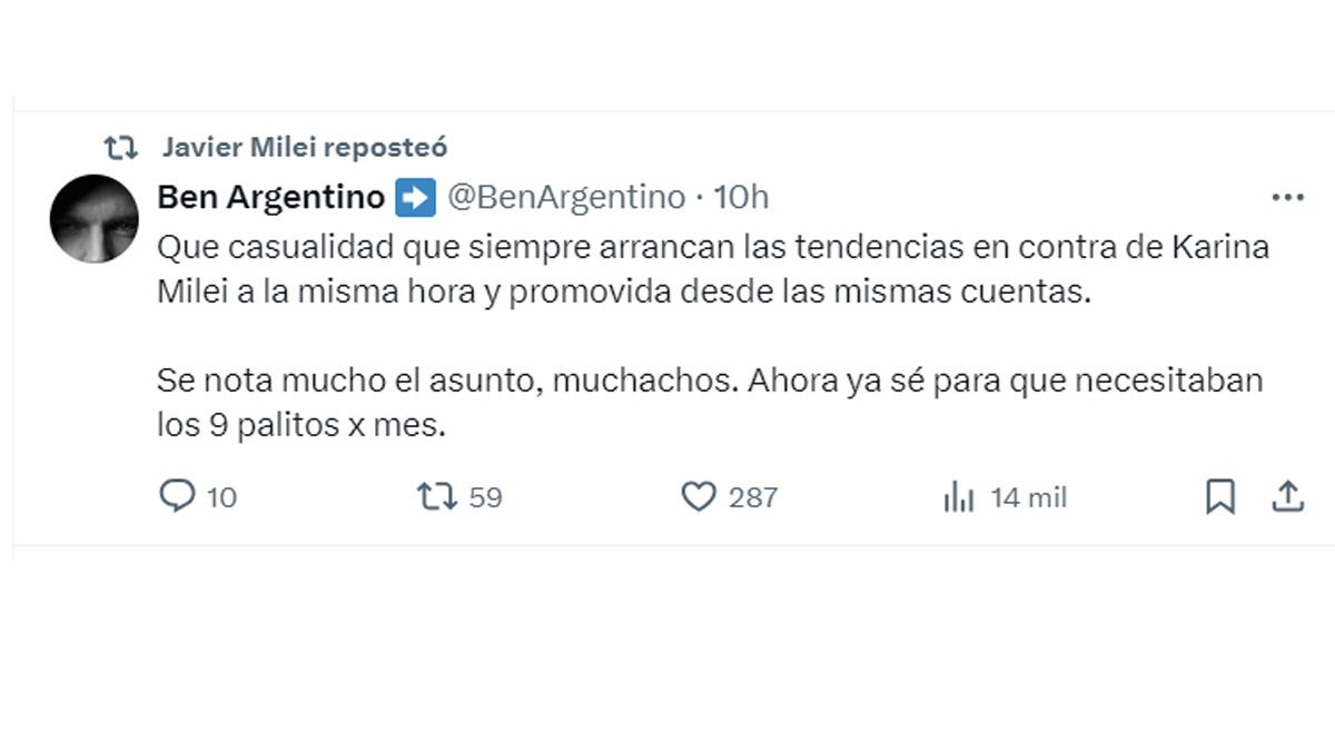 El mandatario compartió en su cuenta de X tres posteos de otros usuarios, en defensa de 'El Jefe' -como la llama él- ante lo que considera una "opereta" con el objetivo de debilitarlo.