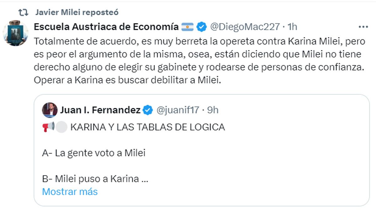 Javier Milei sigue muy activo en las redes sociales (ya no es novedad...) y este miércoles (21/08) salió a defender a su hermana, Karina Milei, secretaria General de la Presidencia, y a su asesor estrella, Santiago Caputo, ante lo que llamó "operetas muy berretas".