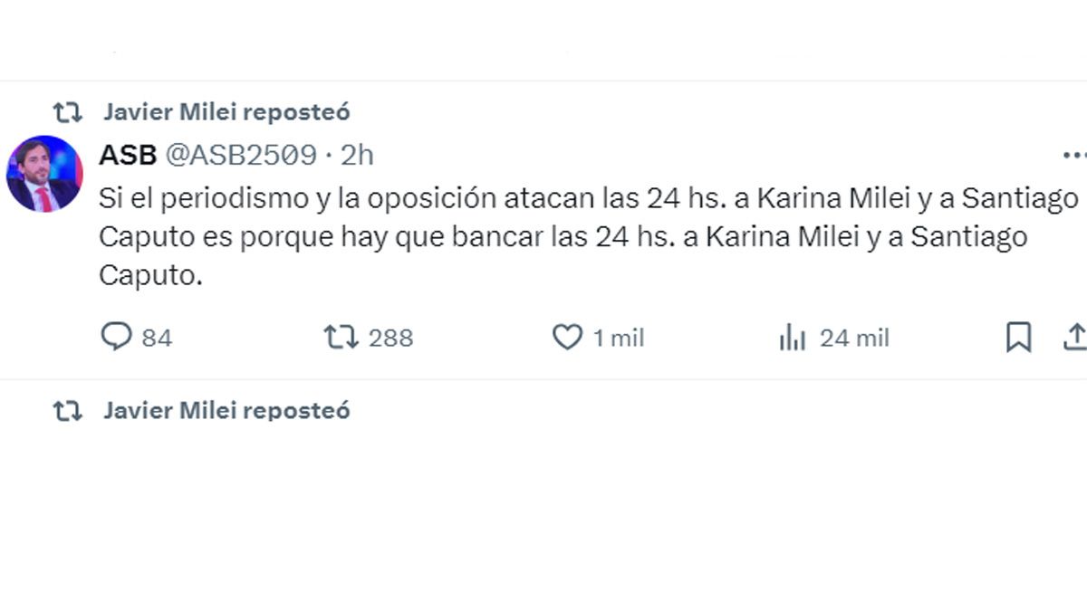 Además, el Presidente volvió a defender a su asesor estrella -sin cargo oficial- Santiago Caputo, acusando a la "oposición" y a los "medios" de atacarlo junto a su hermana.