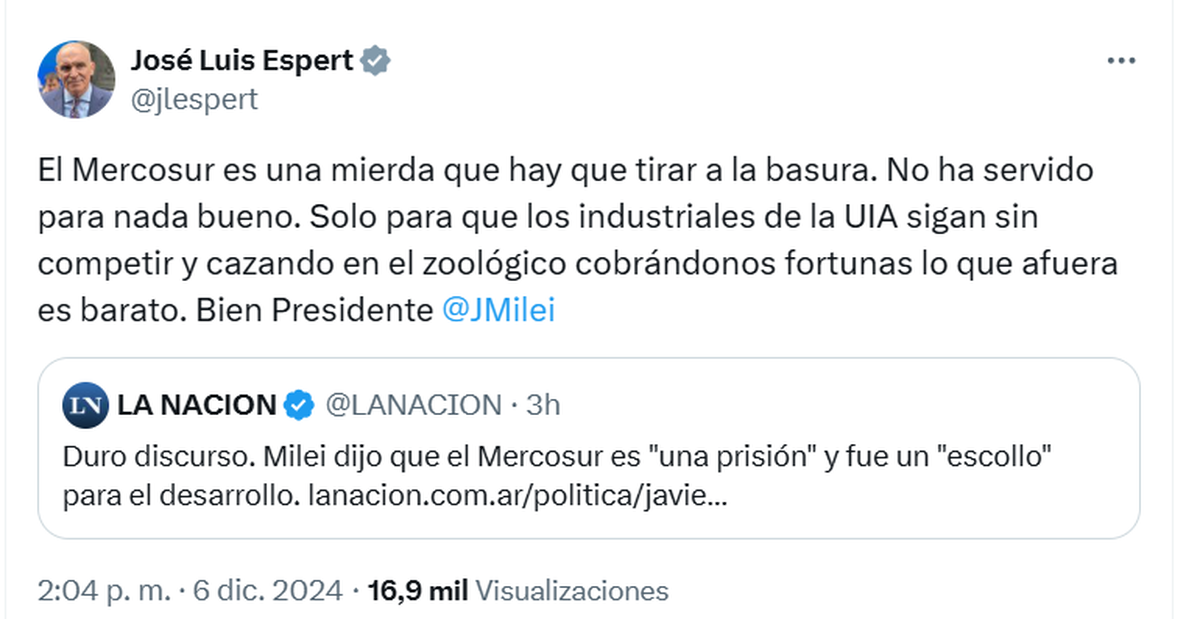 Fiel a su estilo, Espert comentó el discurso de Javier Milei en la cumbre del Mercosur y, exabrupto incluido, opinó que "el Mercosur es una mierda que hay que tirar a la basura. No ha servido para nada bueno". Justo en momentos en que Milei asumió la presidencia pro tempore...