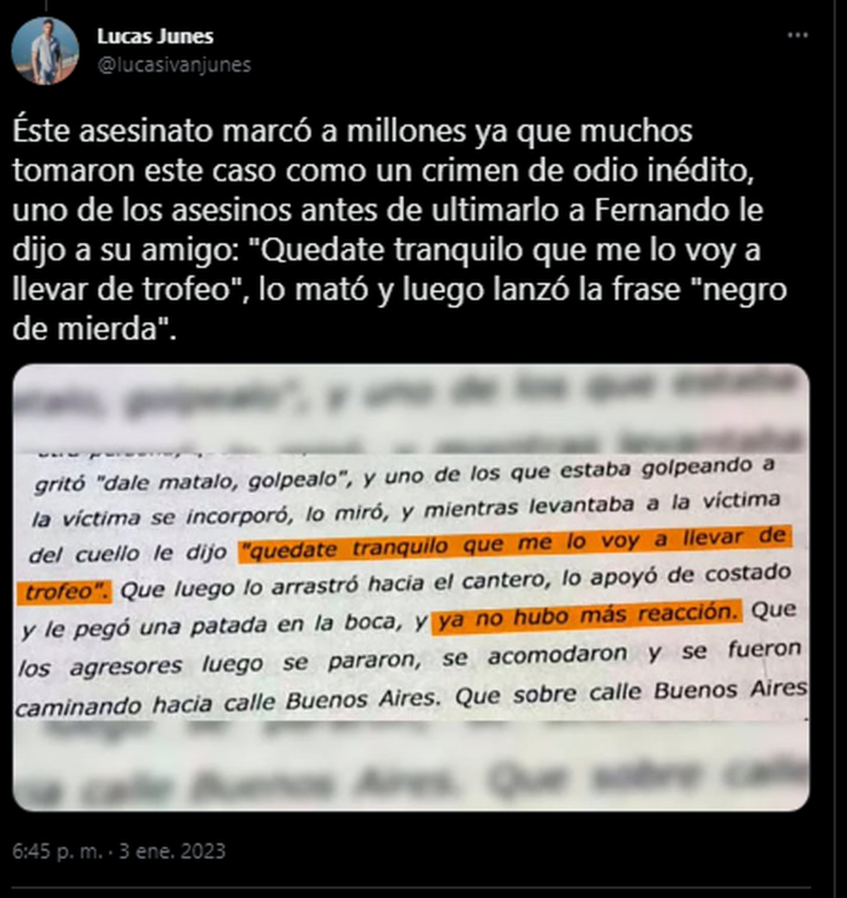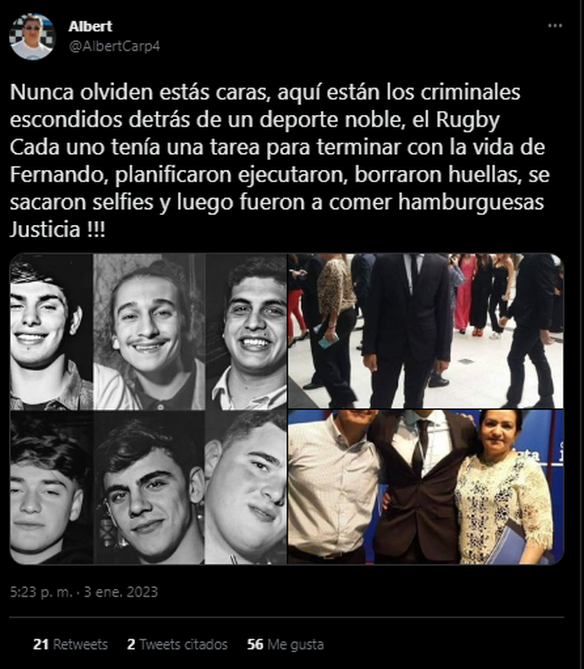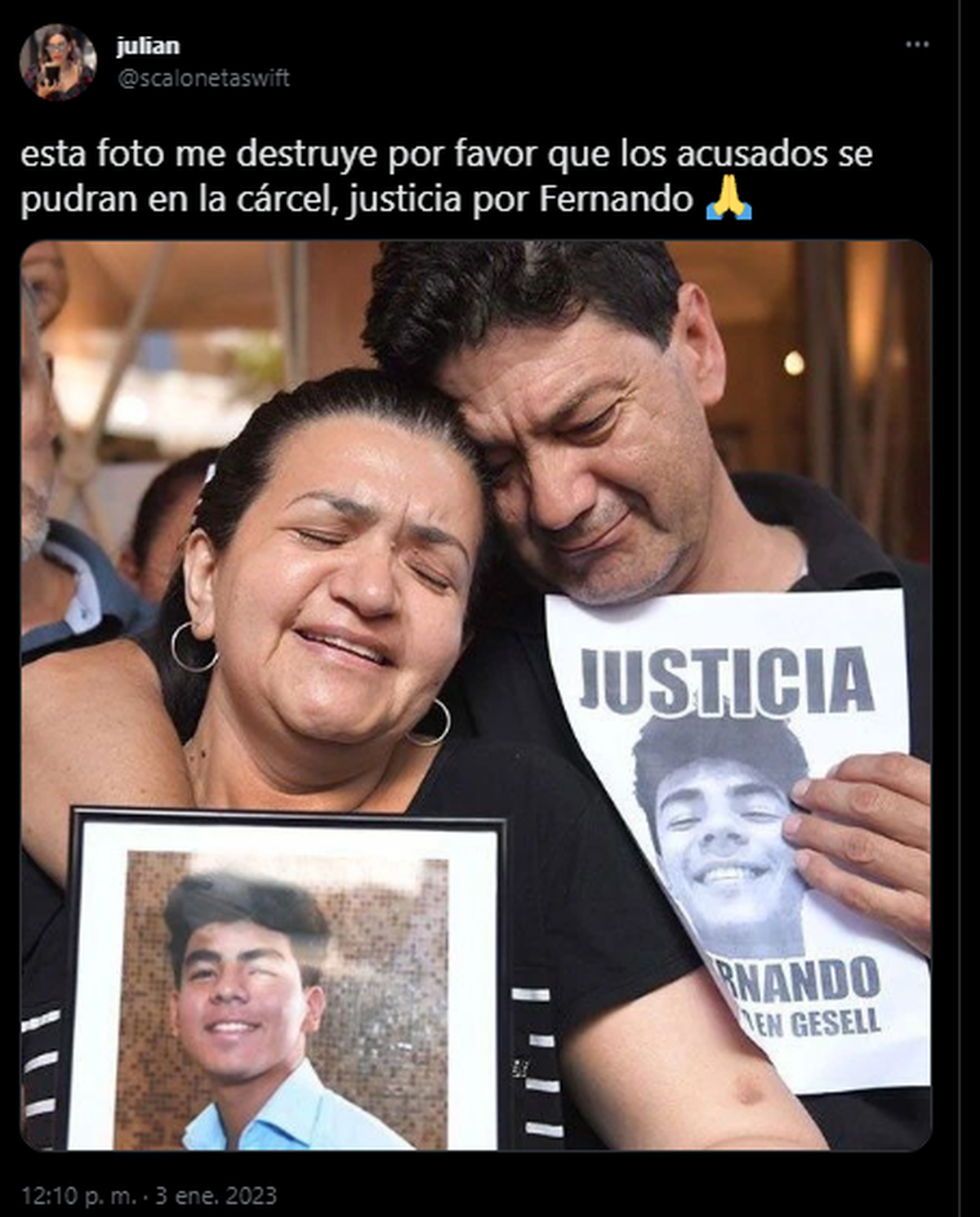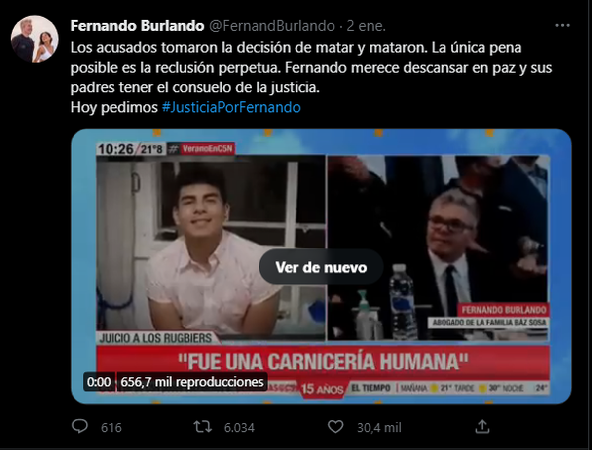 En Twitter el abogado Burlando escribía: “Los acusados tomaron la decisión de matar y mataron. La única pena posible es la reclusión perpetua. Fernando merece descansar en paz y sus padres tener el consuelo de la justicia”.