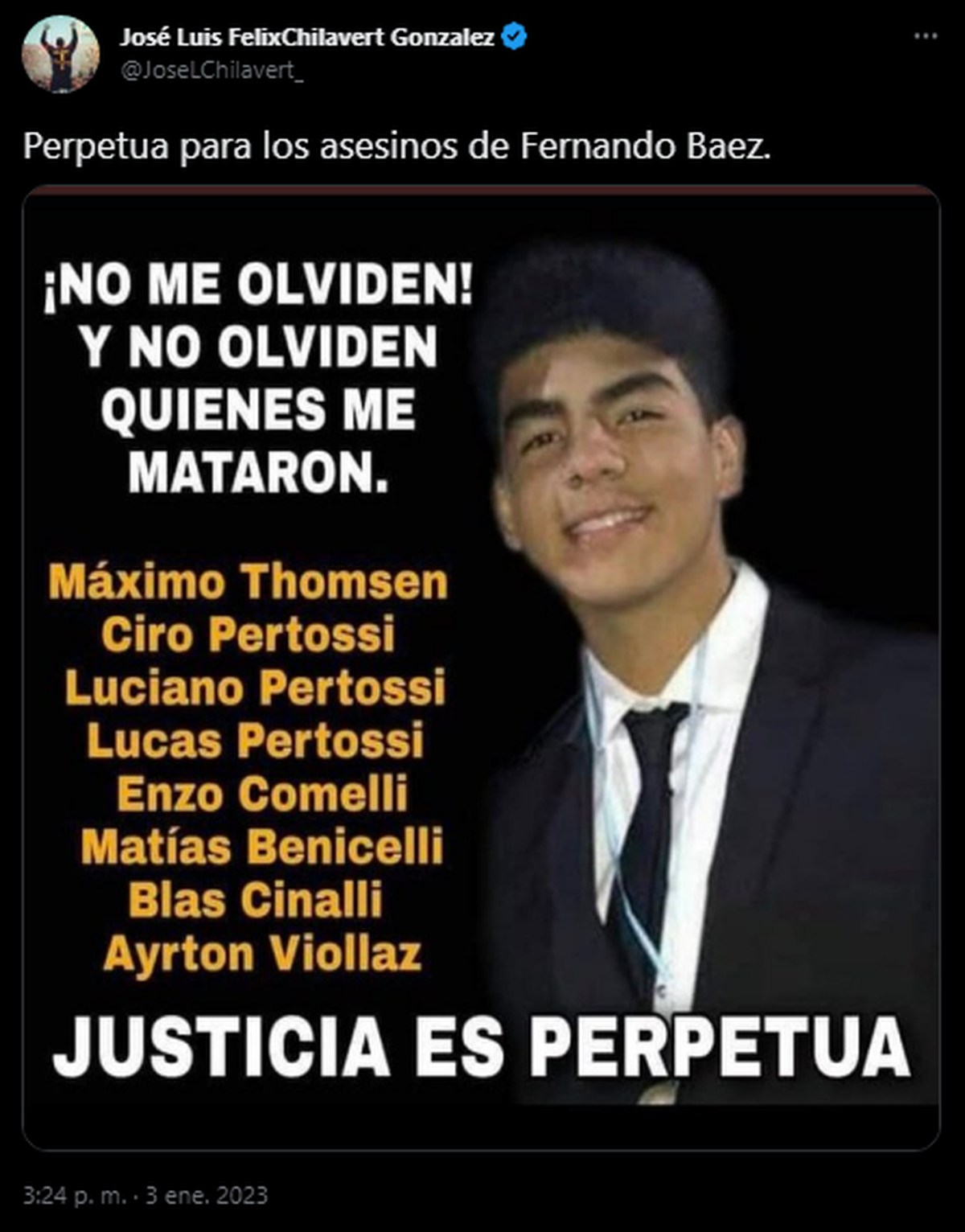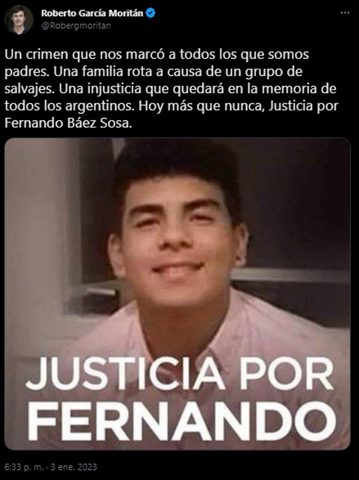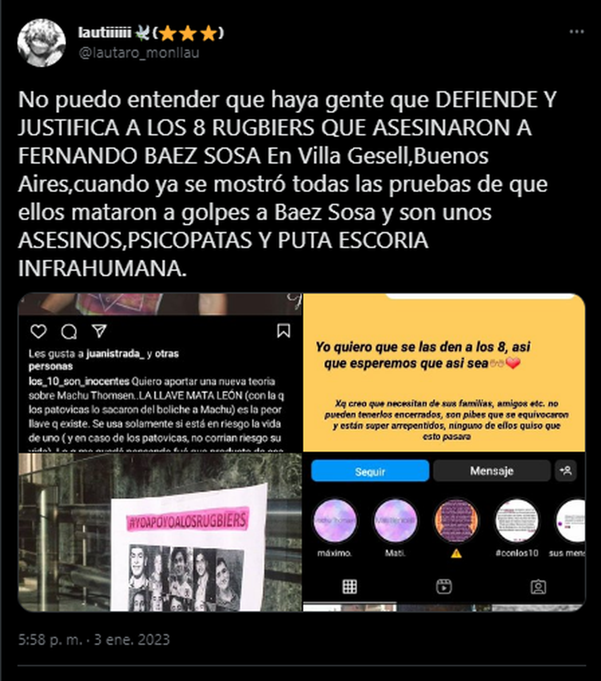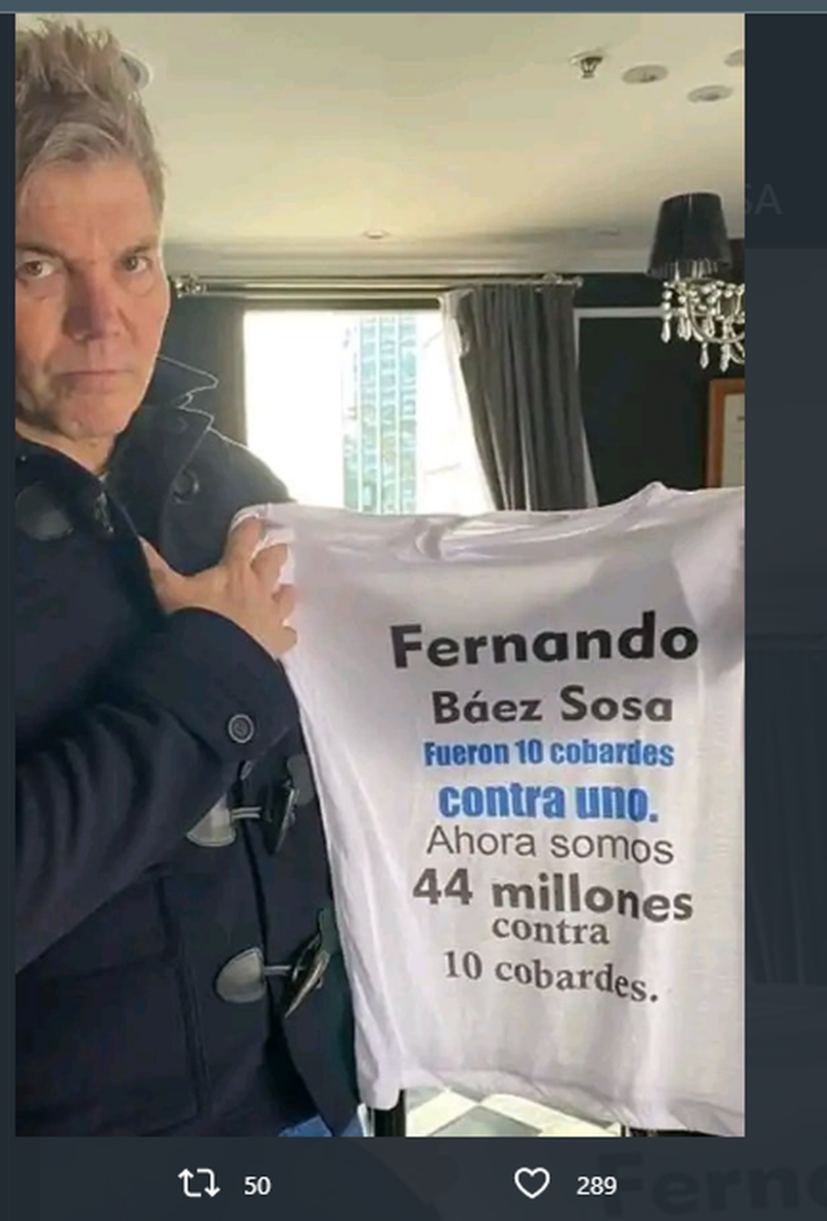 También subió una fotografía en la que posaba junto a una remera en la que se solicitaba justicia por el crimen de Fernando Báez Sosa. Como abogado de la familia y figura pública es menester que de a conocer sus opiniones a nivel público.