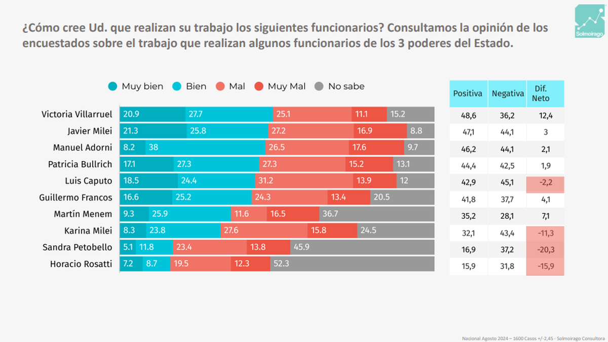 En otro cuadro comparativo, sobre la percepción de cómo "realizan su trabajo" distintos funcionarios, Karina tiene 11,3 puntos de diferencial negativo, aunque aquí la 'salva' Pettovello, que zafa en imagen personal pero arroja una muy mala impresión de su labor como ministra de Capital Humano (20,3 puntos de diferencial negativo).