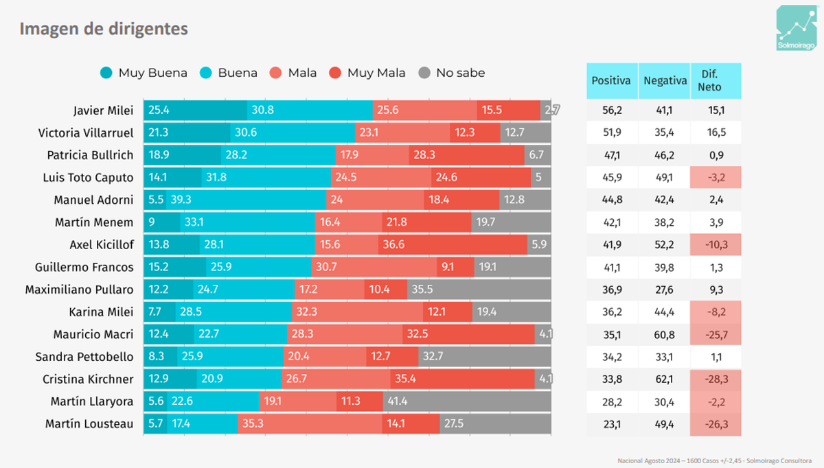 La encuesta de Solmoraigo también indaga en la percepción sobre otros funcionarios y dirigentes. Dentro de la líneas oficialistas sólo 2 figuras tienen saldo adverso, es decir más imagen negativa que positiva: el ministro de Economía, Luis Caputo; y la secretaria general de la Presidencia, Karina Milei.