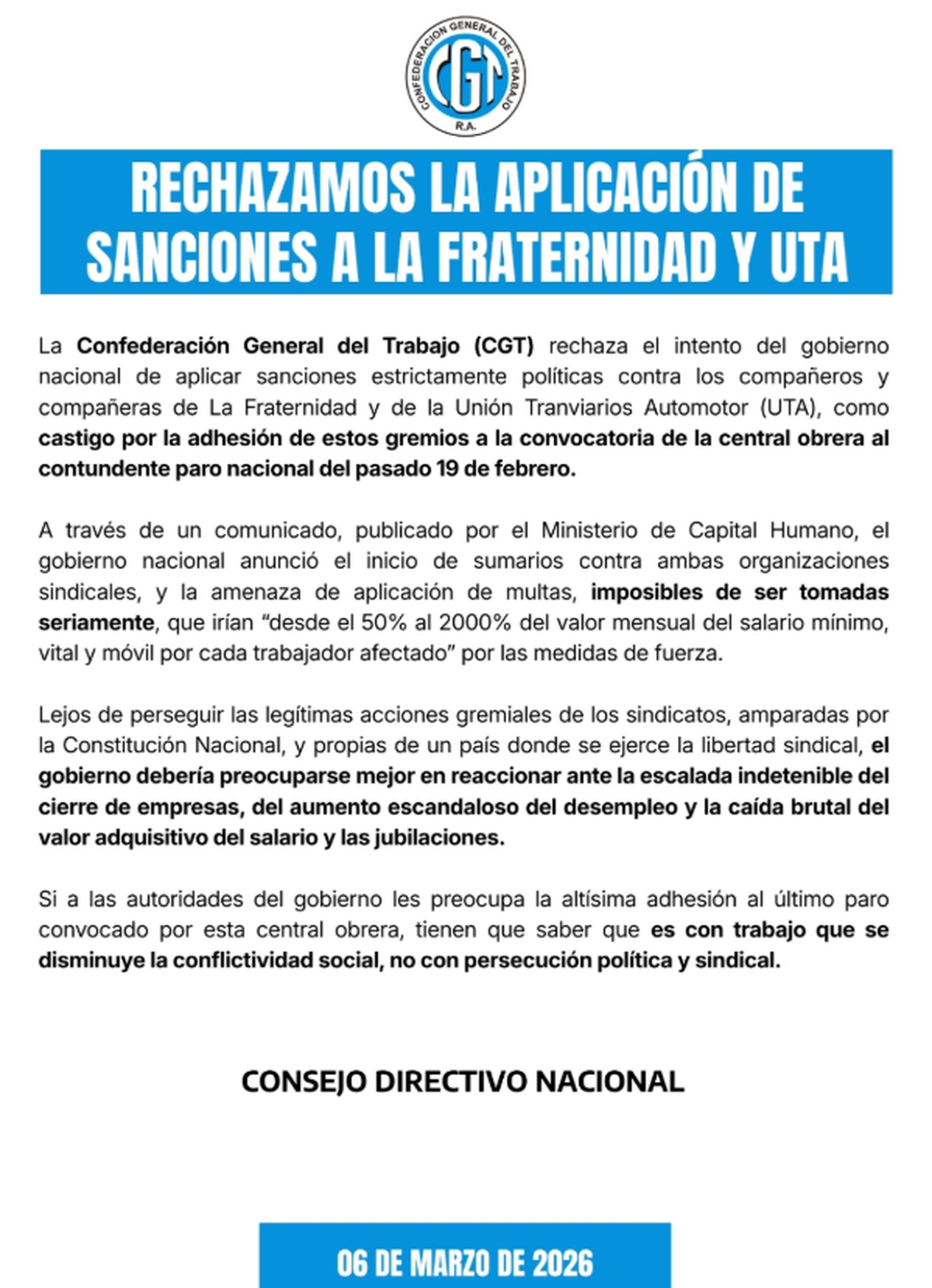 A través de un comunicado, el Consejo Directivo Nacional de la CGT expresó su rechazo al "intento del gobierno nacional de aplicar sanciones estrictamente políticas contra los compañeros y compañeras de la Fraternidad y de la Unión Tranviarios Automotor (UTA), como castigo por la adhesión de estos gremios a la convocatoria de la central obrera al contundente paro nacional del pasado 19 de febrero.”