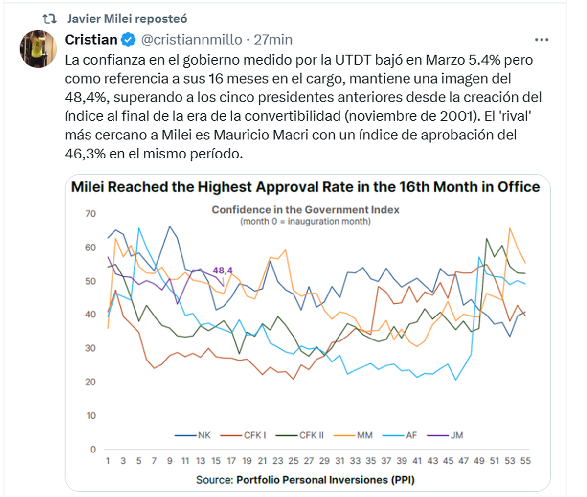El Presidente compartió en X el posteo de un usuario que, si bien marcó la caída del índice en febrero, rescató como dato central que "mantiene una imagen del 48,4%, superando a los cinco presidentes anteriores desde la creación del índice al final de la era de la convertibilidad (noviembre de 2001). El 'rival' más cercano a Milei es Mauricio Macri con un índice de aprobación del 46,3% en el mismo período".