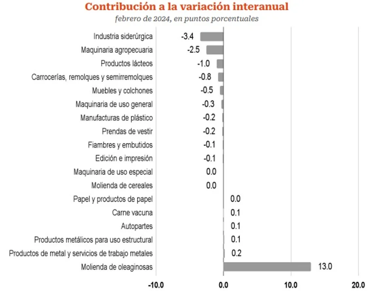 Cinco importantes actividades fabriles enfrentaron en el segundo mes (2024) importantes descenso de actividad, dando cuenta de la mayor parte de la caída total (-5,4%) observada por el conjunto de la industria manufacturera en la provincia.