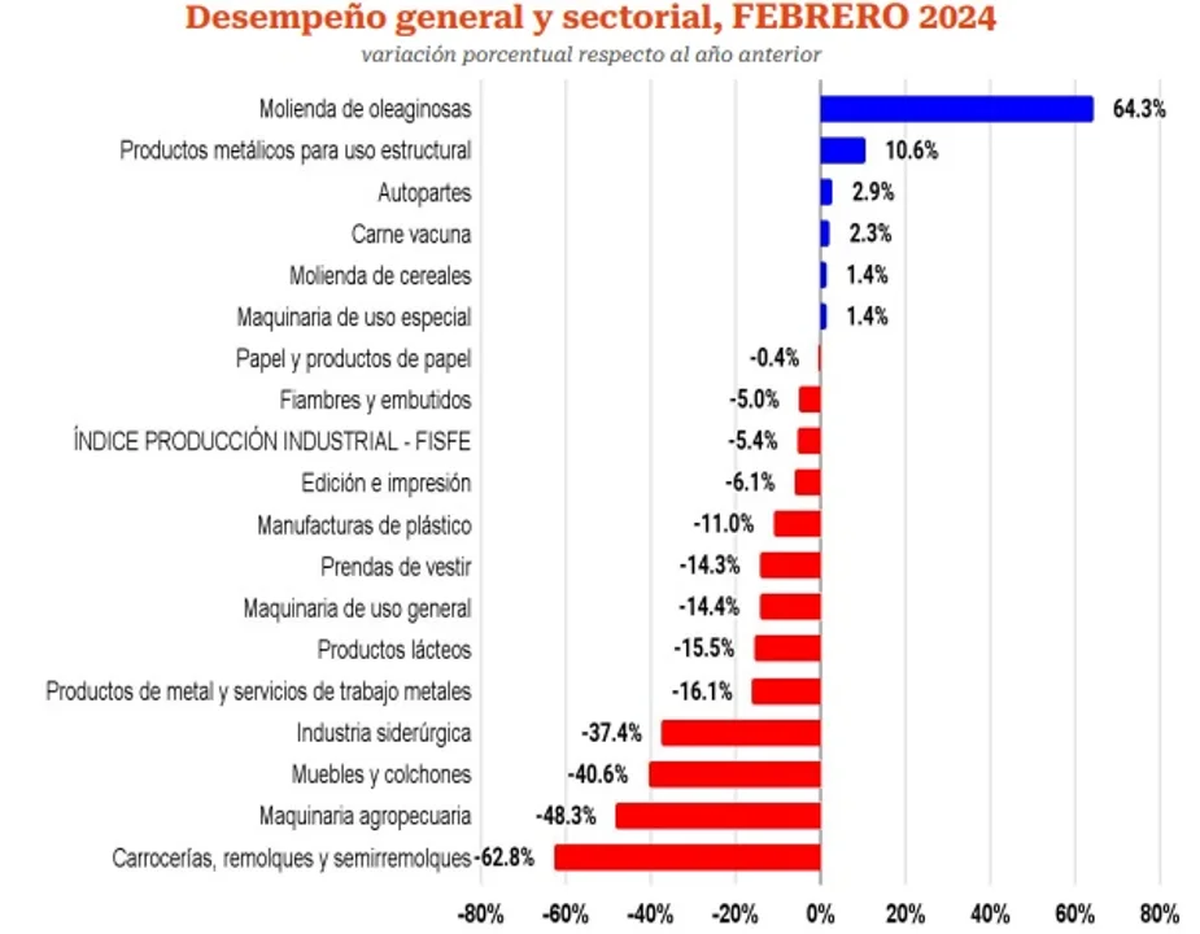 La producción industrial de Santa Fe registró en febrero una disminución del 5,4% interanual. Durante el primer bimestre del 2024, la actividad fabril estuvo nuevamente impactada, principalmente por la menor demanda interna en numerosos sectores, lo que provocó un ajuste de la producción, el adelantamiento de vacaciones y freno de plantas. Datos preocupantes de cara al futuro.