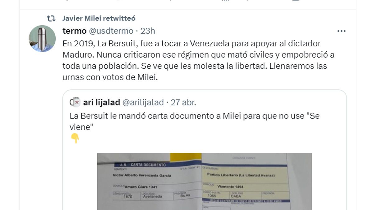 Uno de los comentarios que retuiteó el libertario hacía referencia a que La Bersuit fue a tocar en 2019 a Venezuela "para apoyar al dictador Maduro".