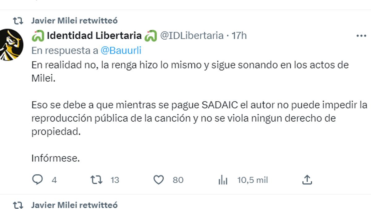 "La Renga hizo lo mismo y sigue sonando en los actos de Milei. Eso se debe a que mientras se pague SADAIC el autor no puede impedir la reproducción pública de la canción y no se viola ningún derecho de propiedad", explicaba el mensaje compartido por Milei en Twitter.