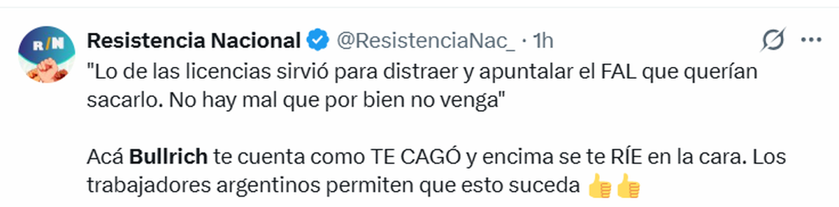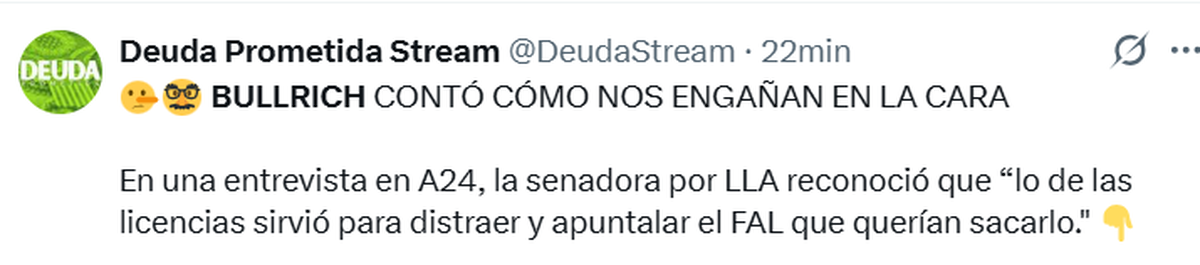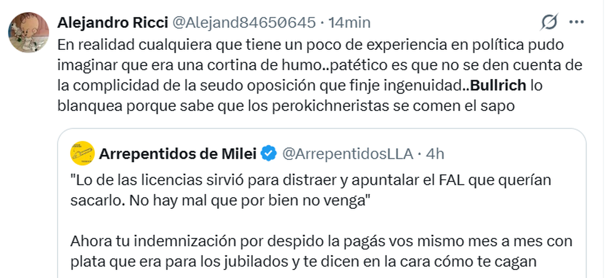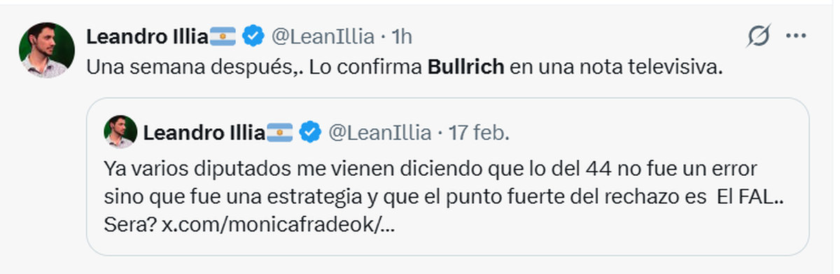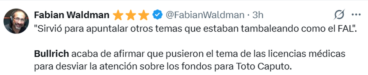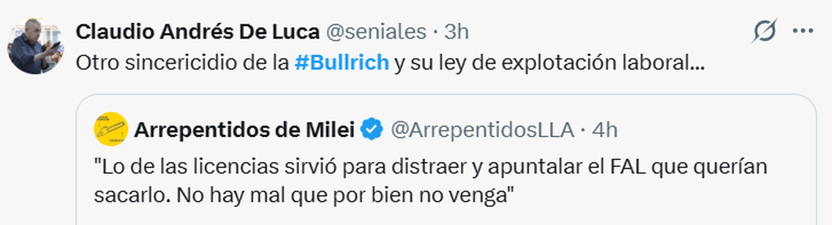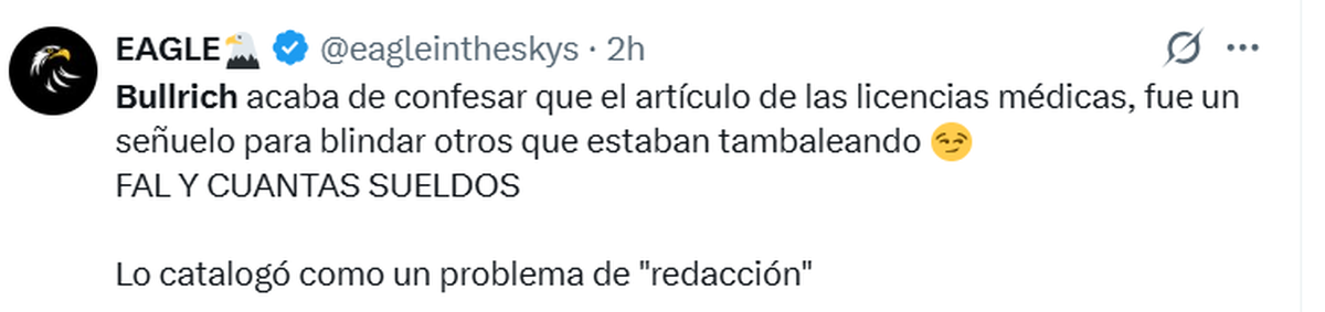 La jefa del bloque libertario en el Senado, Patricia Bullrich, admitió que fue un " error" de "redacción" el artículo 44 de la reforma laboral sobre las licencias médicas pero, con una risita, dejó entrever que fue una maniobra para desviar la atención y aprobar otros puntos polémicos, como el Fondo de Asistencia Laboral (FAL).