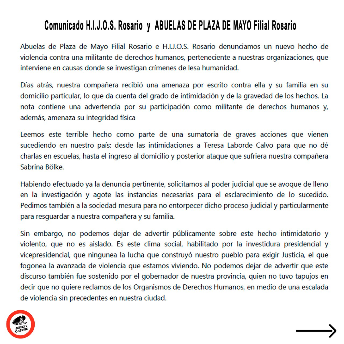 El texto completo relata, por medio de Abuelas e HIJOS Rosario, lo ocurrido. En primera instancia, las agrupaciones remarcan la denuncia ante un nuevo hecho de violencia contra una integrante de la organización. "Días atrás, nuestra compañera recibió una amenaza por escrito contra ella y su familia en su domicilio particular, lo que da cuenta del grado de intimidación y de la gravedad de los hechos".