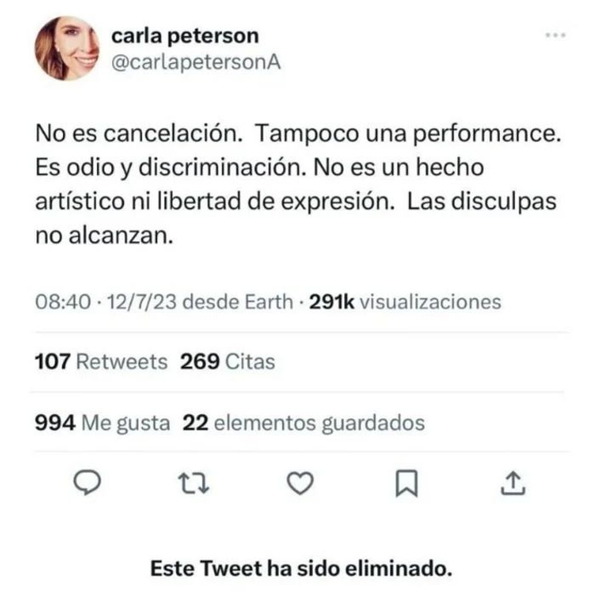 “No es cancelación. Tampoco una performance. Es odio y discriminación. No es un hecho artístico ni libertad de expresión. Las disculpas no alcanzan ”
