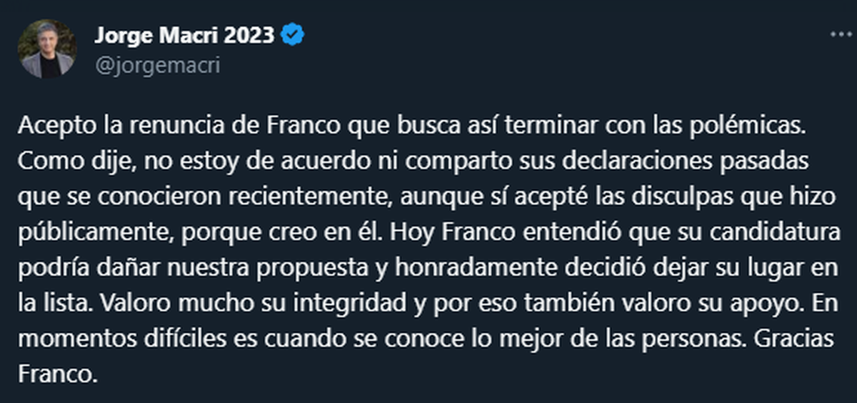 Jorge Macri, por su lado, comentó que aceptaba la renuncia de Rinaldi y, aunque no compartía los dichos desafortunados que realizó este con anterioridad, valoraba su honestidad: