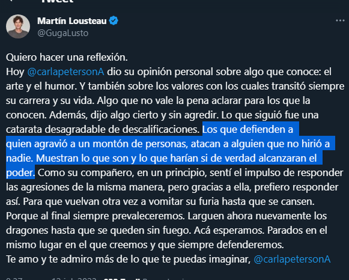 Después ella borró su tuit, aunque Losteau redobló la apuesta para minimizar a quien, con anterioridad, había defendido de un ataque discriminatorio por parte de LLA: