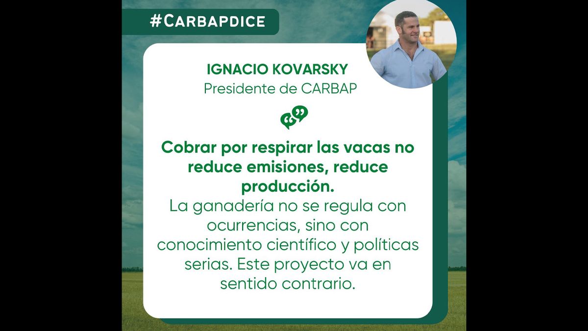 Según el presidente de CARBAP, Ignacio Kovarsky, no existen métodos actuales para calcular la cantidad de gases emitidos efectivamente por cada vaca, ni mucho menos sistemas de medición para todo un lote de animales. A partir de ello, el productor señaló que la intención del proyecto sería “cobrar un impuesto que no se puede medir ni auditar”.