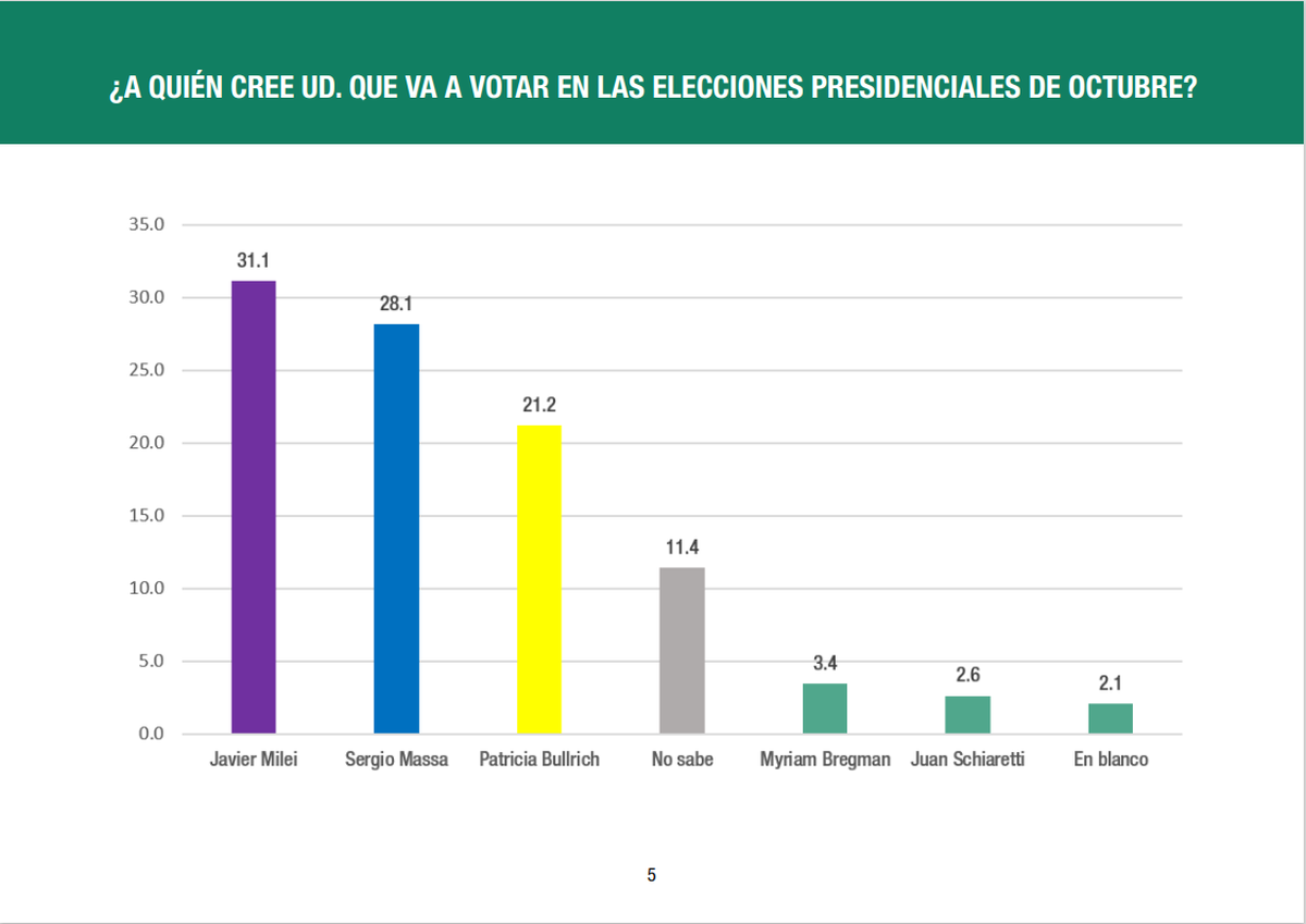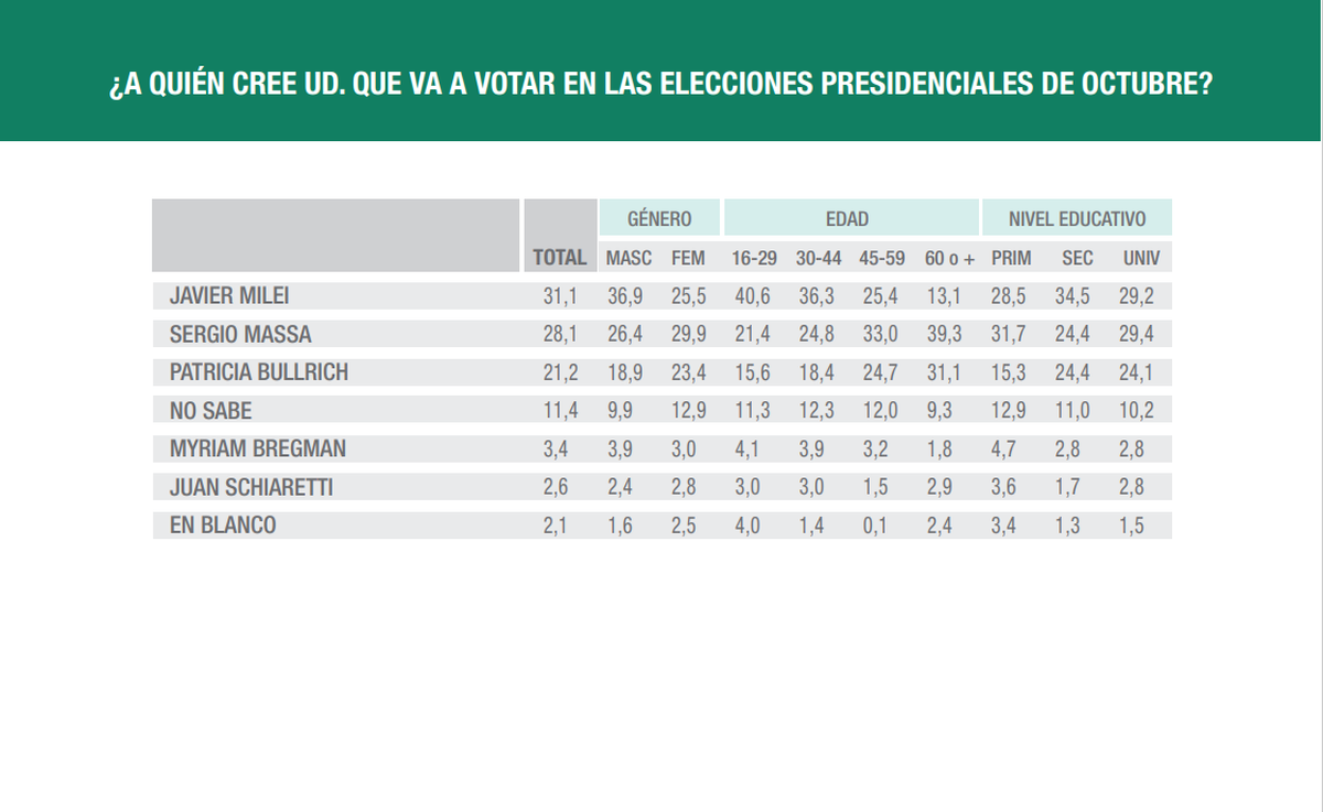 La medición la encabeza Milei, con el 31,1, seguido de Massa, con el 28,1, y Patricia Bullrich, con el 21,2%. En 4to lugar aparecen los indecisos, con el 11,4% y luego el resto de las opciones que no llegan ni a los 5 punto.