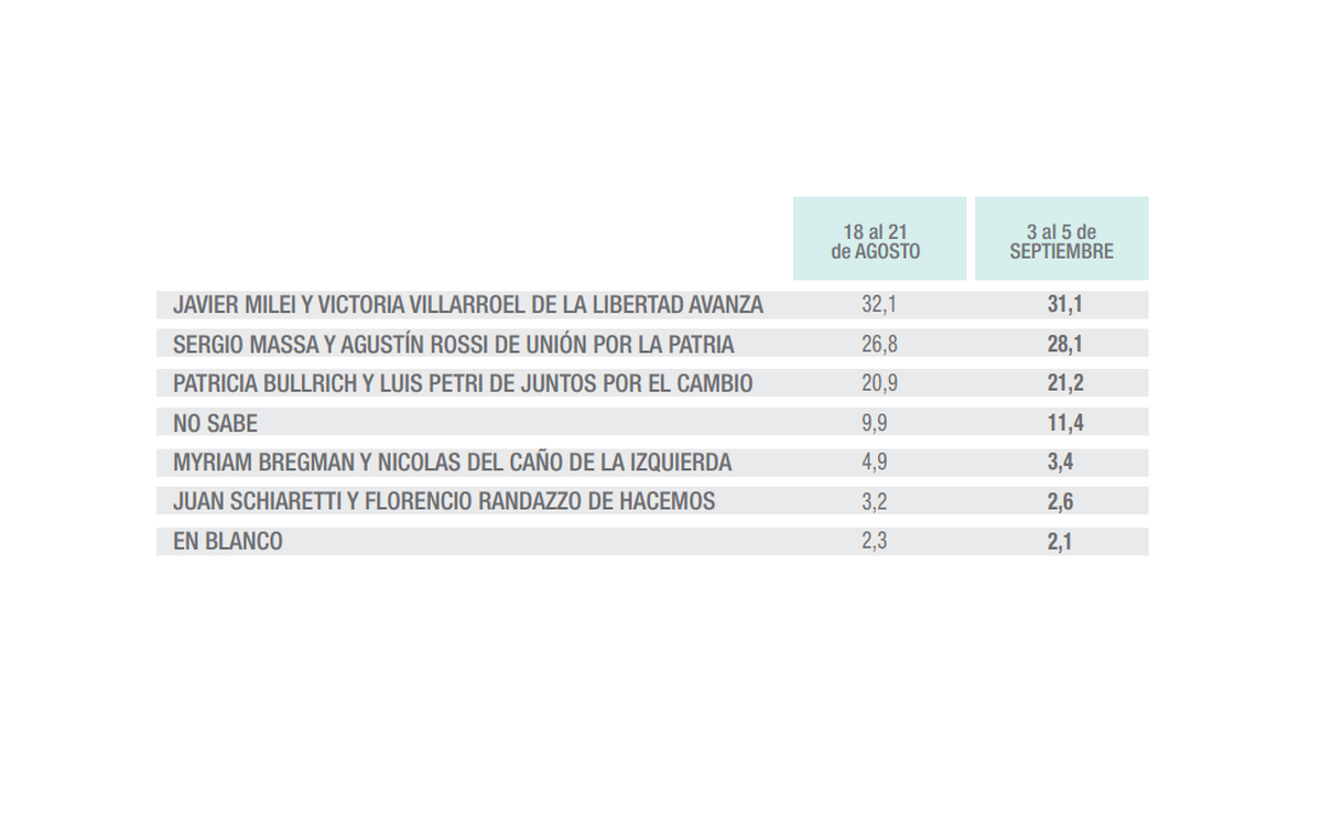 Así se refleja que Milei retrocedió un punto, mientras que Massa avanzó 1,3 y Bullrich, apenas 3 décimas. Un mayor crecimiento mostró el voto en blanco, de 1,5 puntos. De todas formas, los movimientos se encuentran dentro del margen de error, por lo que se trata de un panorama estable entre un sondeo y el otro.