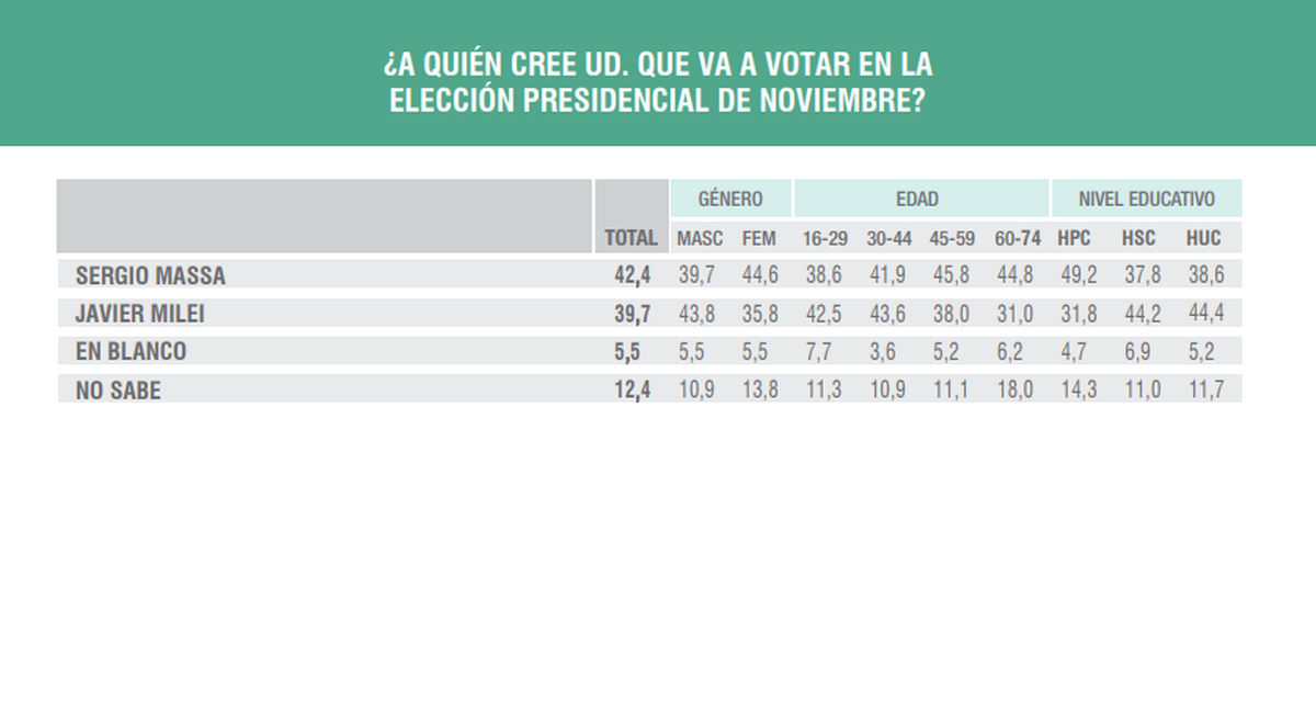 Como se dijo, Massa no perdió votos en relación al sondeo previo, pero el estatismo que mostró en ese lapso abre el interrogante sobre si el candidato oficialista llegó a un techo, en los términos de esta encuesta.