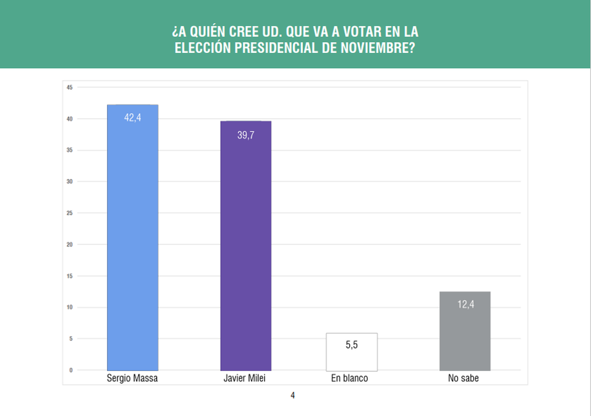 Massa sigue liderando la intención de voto con el mismo guarismo, 42,4%. Milei, en tanto, creció más de 5 puntos, hasta el 39,7%. La brecha se redujo de 8 a 4 puntos, y si se ajusta por el margen de error de la encuesta el escenario es de empate técnico, en consonancia con otros sondeos.