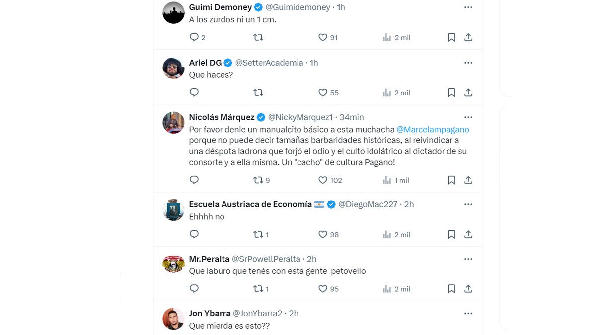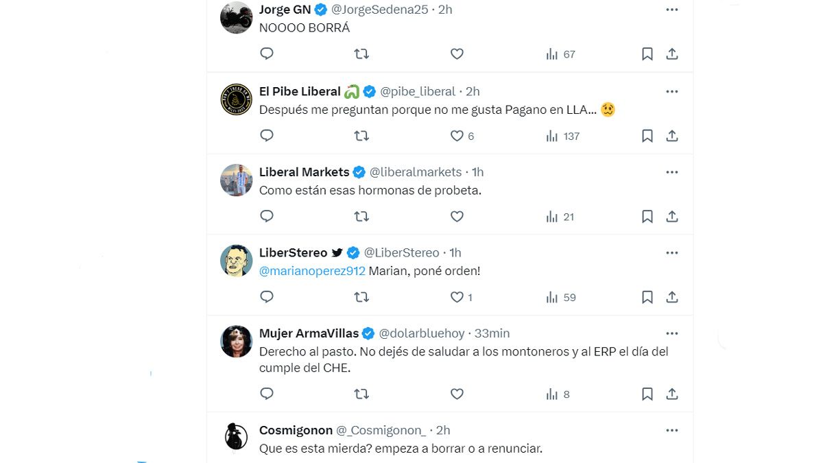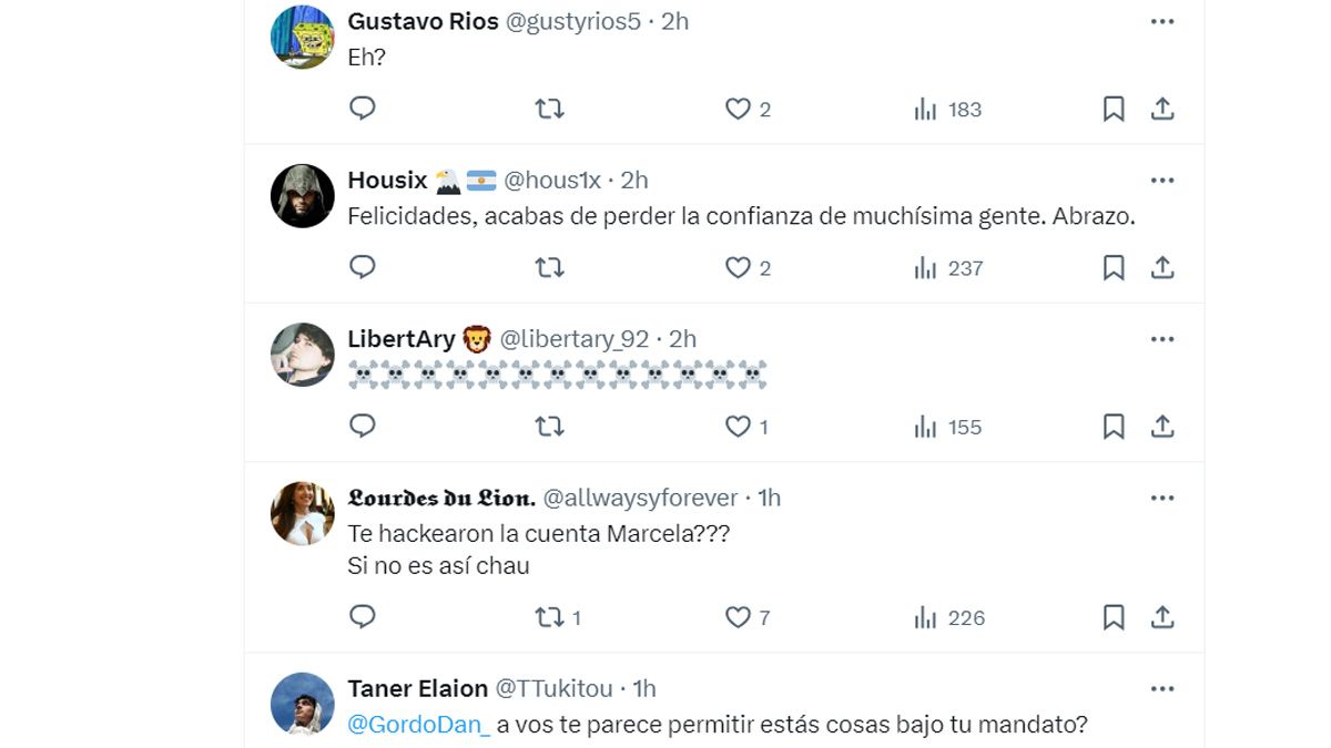 Los trolls libertarios piden su renuncia y chicanean: "¿te hackearon la cuenta?". Algunas de las muchas respuestas a Marcela Pagano: