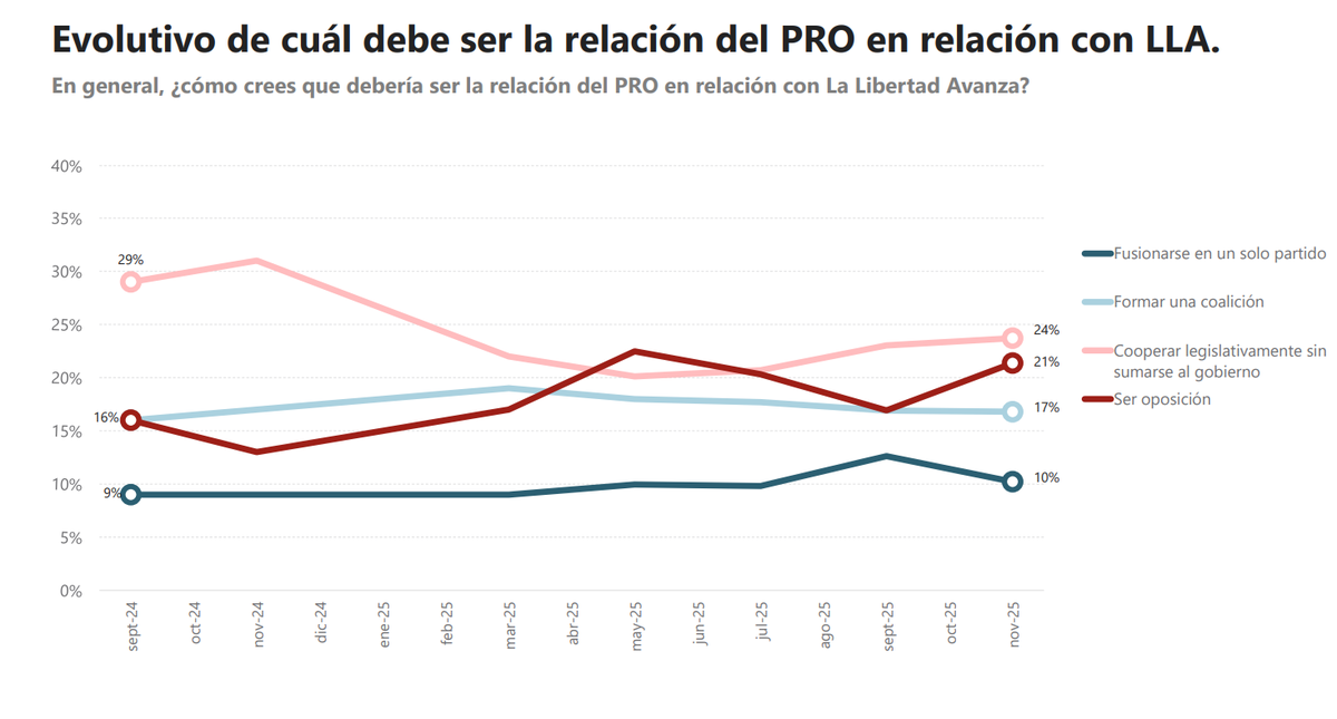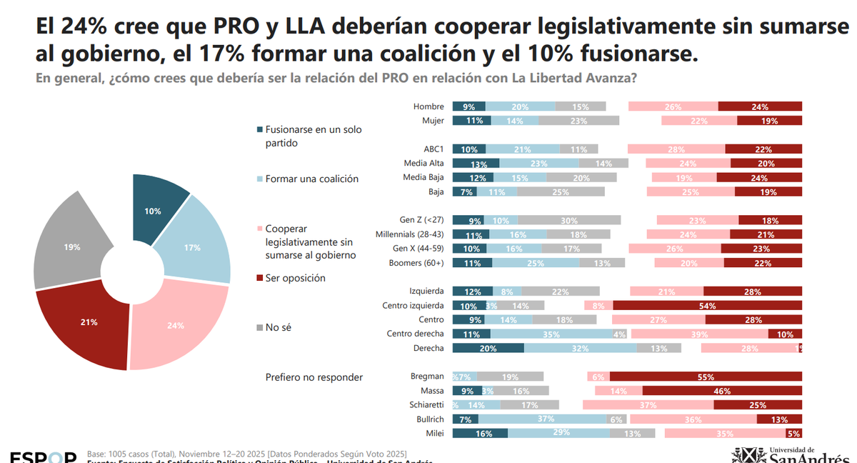 Según el sondeo de Udesa realizado en noviembre, la mayoría de los encuestados (24%) opinó que el PRO debe "cooperar legislativamente sin sumarse al gobierno" libertario. Luego, el 21% consideró que debe ser "oposición".