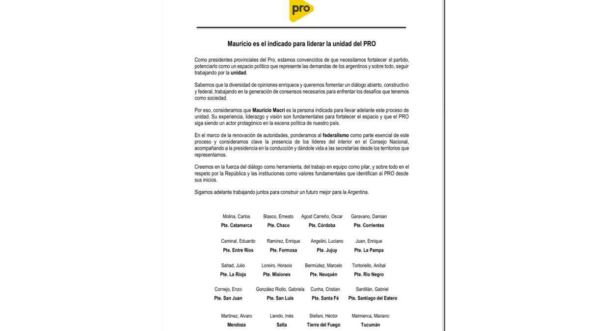 "Como presidentes provinciales del PRO, estamos convencidos de que necesitamos fortalecer el partido, potenciarlo como un espacio político que represente las demandas de los argentinos y sobre todo, seguir trabajando por la unidad", inicia el texto.