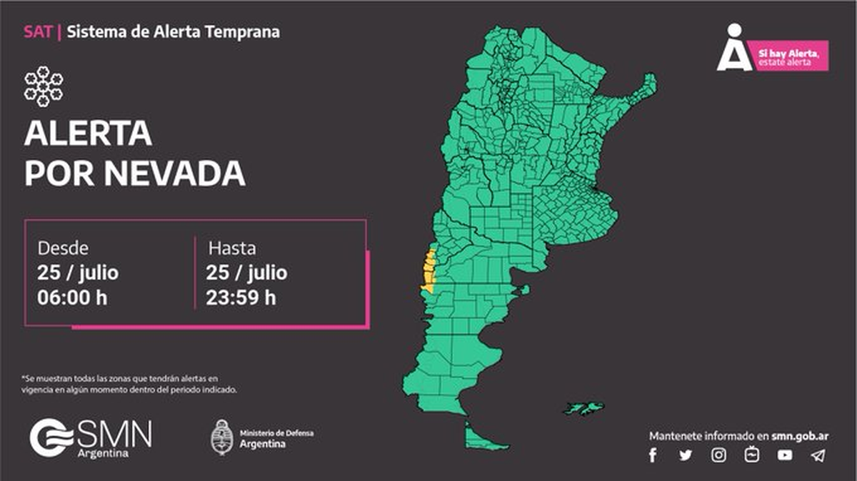 Bueno para los centros de deportivos de pero no tanto para los habitantes estables. El SMN puso en alerta por nevadas para el sur de Neuquén, en la cordillera de Huiliches, de Lácar y el Aluminé; toda la cordillera de Río Negro en localidades como Bariloche y la cordillera de Ñorquincó; y una porción del noroeste de Chubut, en la cordillera de Cushamen.
