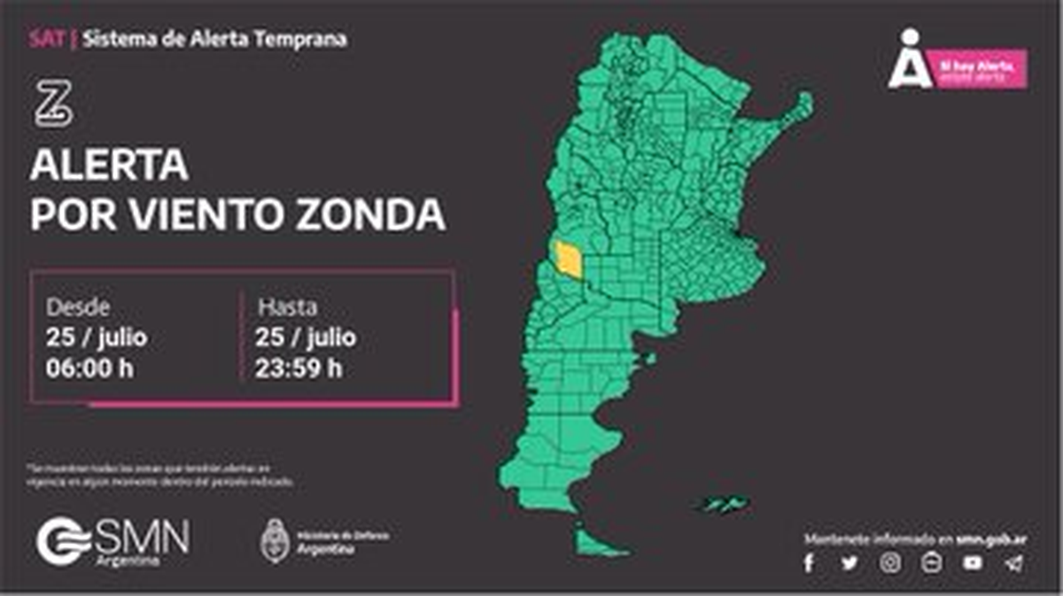 Otra zona en alerta por viento Zonda comprende al sur de Mendoza, en las proximidades de Malargüe, donde se esperan vientos con velocidades entre 35 y 50 kilómetros por hora y ráfagas que pueden superar los 70 km/h.