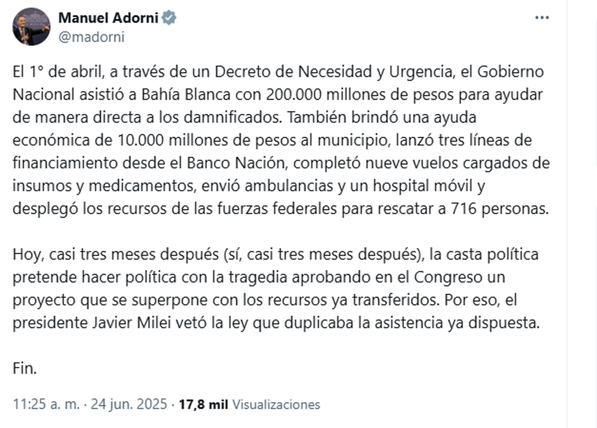Mediante un posteo en X, Adorni recordó que un decreto de Milei asistió a Bahía Blanca con $200.000 millones a los damnificados y con 10.000 millones al municipio, entre otras medidas y acusó a los legisladores de pretender hacer "política" mediante la sanción de la emergencia el 4 de junio pasado.